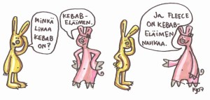 Ehkä parhaat kebabit olen vetäissyt Tapiolan Kilimissä (lounasbuffa, nam!), Iso-Roban Persepoliksessa sekä tietty Erikin pippurissa. Huonoimmat taas Otaniemen Täffällä, jossa ”liha” vaikutti HK:n sinisestä vuollulta.