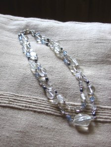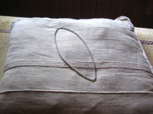 Siskoltani sain tehtävänannoksi korun hänen kostyymiinsa sopivaksi. Olin etukäteen kuullut, että mekko oli ”siniharmaa ja vähän barokkityylinen”. Ajattelin ekana, että onpas reilu veto pikkusiskolta laittaa vaatimaton, ”vähän barokkityylinen” mekko veljensä häihin. Mutta kyseessä olikin siis kaunis ja yksinkertainen mekko, jossa oli aplikoitu barokkityylisiä kuvioita. Tilasin barokkimekkoa varten jo hirveän kasan stimangeja Satuhelmestä, mutta tilaus viipyi matkalla noin kuukauden, enkä ehtinyt saada aarteitani ajoissa. Niinpä jouduin haalimaan varastoistani ja Sinellistä erinäisiä killuttimia, joista kasasin viimeisenä iltana helmet. Mutta eipä ne Satuhelmen stimangitkaan hukkaan menneet, sillä niille kyllä keksitään käyttöä nyt ja myöhemmin.