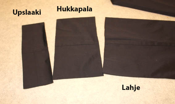 Lauantaiaamuna 2 tuntia ennen kuin piti olla valmiina lähtöön, leikkasin lahkeista reilut 20 cm pois. Poisleikatuista paloista nappasin vielä noin 7 cm palan talteen aivan lahkeen reunasta. Näin sisäisten silmieni edessä kaprit, joiden lahkeissa olisi upslaakit.