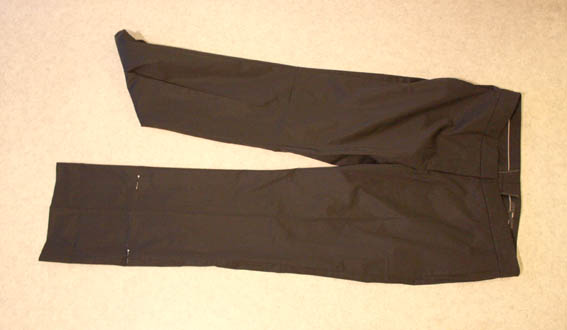 Onnittelin jo itseäni mielessäni hyvästä ja kivuttomasta tunnin tuunaussessiosta ja loistavasta lopputuloksesta, mutta siihen sitä sitten kompastuttiinkin. Tajusin kyllä, että upslaakipalan sauman pitäisi tulla housujen oikealle puolelle, ja että jos jättää housut oikeinpäin ja kääntää upslaakin nurinpäin, niin homman pitäisi toimia. Mutta jostain syystä ajattelin myös, että sehän on sama asia kuin että kääntäisi housut nurinpäin ja jättäisi upslaakin oikein. Ompelin itsevarmasti upslaakipalan kiinni housuihin ja saumuroin reunat huolellisesti, ja vasta sitten vaivauduin ensimmäistä kertaa kääntämään työn. Tajusin, että minulla oli käsillä erittäin siisti lahkeen jatke – mutta jos upslaakin taittaisi ylös, töröttäisivät saumat julkisivupuolelle. Purkuun.