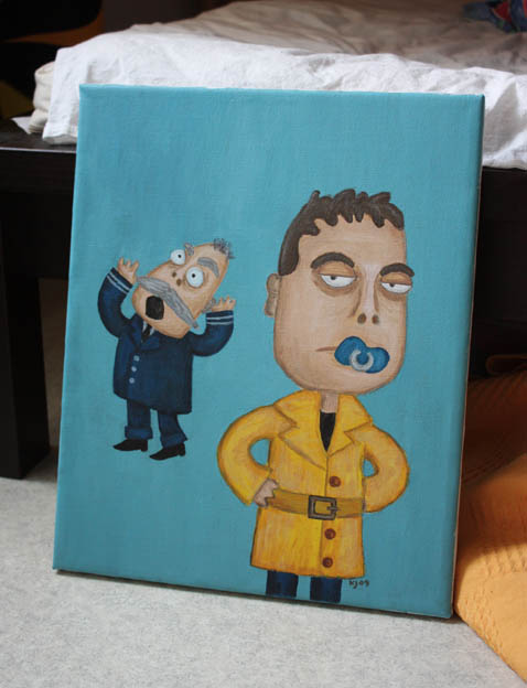 Maalasin kummipojalle nimiäislahjaksi Suojelusenkeli-aiheesta maallisemman version, Suojeluspoliisi-taulun. Kummilapsi voi olla sähäkkä nuori konstaapeli, joka kokeilee rajojaan, kun taas kummit voivat olla vanhemman poliisipäällikön kaltaisia taustavaikuttajia hänen elämässään.