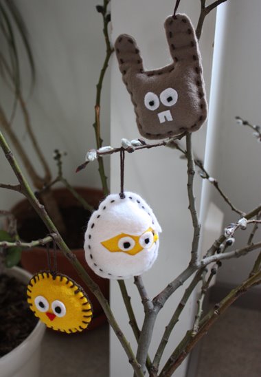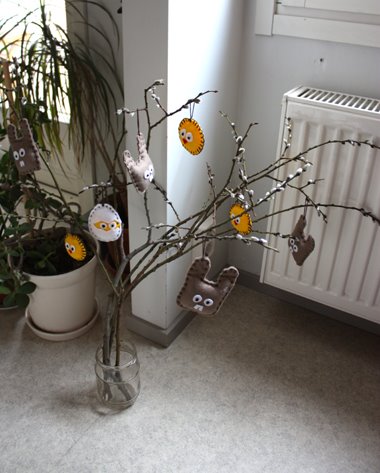 Tämä päivä vierähti väärän puun takaisten sukulaisten seurassa lammasta ja rahkapiirakkaa syöden. Vein viemisiksi pääsiäisrisut, joihin ripustin pupuja ja tipuja. Vähän niukoista aineksista tuli nysvättyä: tuo munasta kuoriutuva tipu oli pakko tehdä noin, kun keltainen huopa loppui kesken. No, mutta niukkuus synnyttää luovuutta.
