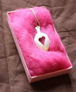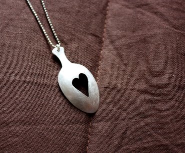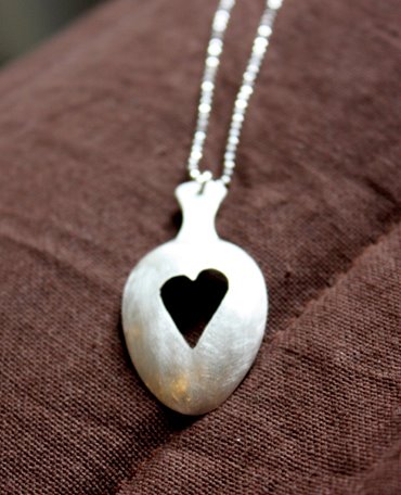 Katkaisin pienen hopealusikan varren, sahasin kuppiin sydämen ja tein siitä riipuksen. Porasin reiän ja hinkutin hiomapaprulla säihkyvän mattapintaiseksi. Juoksin puoli kaupunkia sopivan ketjun perässä.