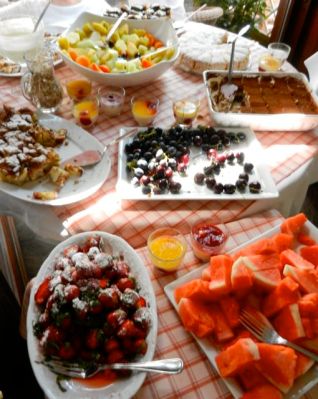 Venäläis-saksalainen ravintola Pasternak Prenzlauer Bergissä tarjoili runsaimman brunssin, mitä olen kuunaan syönyt. Tarjolla oli noin 30 suolaista herkkua marinoiduista munakoisoista munakasrulliin, pikkublineistä sipulipiirakkaan ja lisäksi lohta, röstiperunaa, salaattia, mäti-kananmuna-hörsöjä ja vaikka sun mitä. Eikä siinä vielä kaikki, tarjolla oli myös tusinan verran jälkiruokia: rahkalettuja, romanovin mansikoita, tiramisua, voitaikinatikkuja, struudelia, hedelmiä ja nam nam. Brunssipöytä kustansi 12,50 henkilöltä plus juomat. Eipä tarvinnut syödä seuraavan kerran kuin vasta iltakahdeksalta.