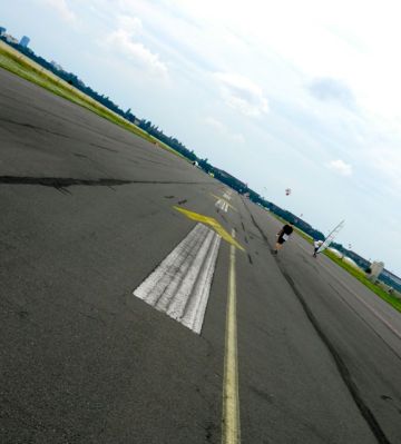 Vanha lentokenttä, joka ei ole enää lentokenttäkäytössä. Kenttä on nykyisin puisto, jonne ihmiset tulevat piknikille, grillaamaan, fillaroimaan, rullaluistelemaan, rullalautailemaan ja pelaamaan minigolfia. On jotenkin huikeeta, että natsien lentokentällä harrastetaan tänä päivänä kaupunkiviljelyä. Lentokenttärakennukseen olisi ollut kiva päästä sisälle (yleensä sinne kai pääseekin), mutta jo julkisivu nostatti ihon kananlihalle. Kiitoradalla oli kyllä vaan aika makeeta tallustella.
