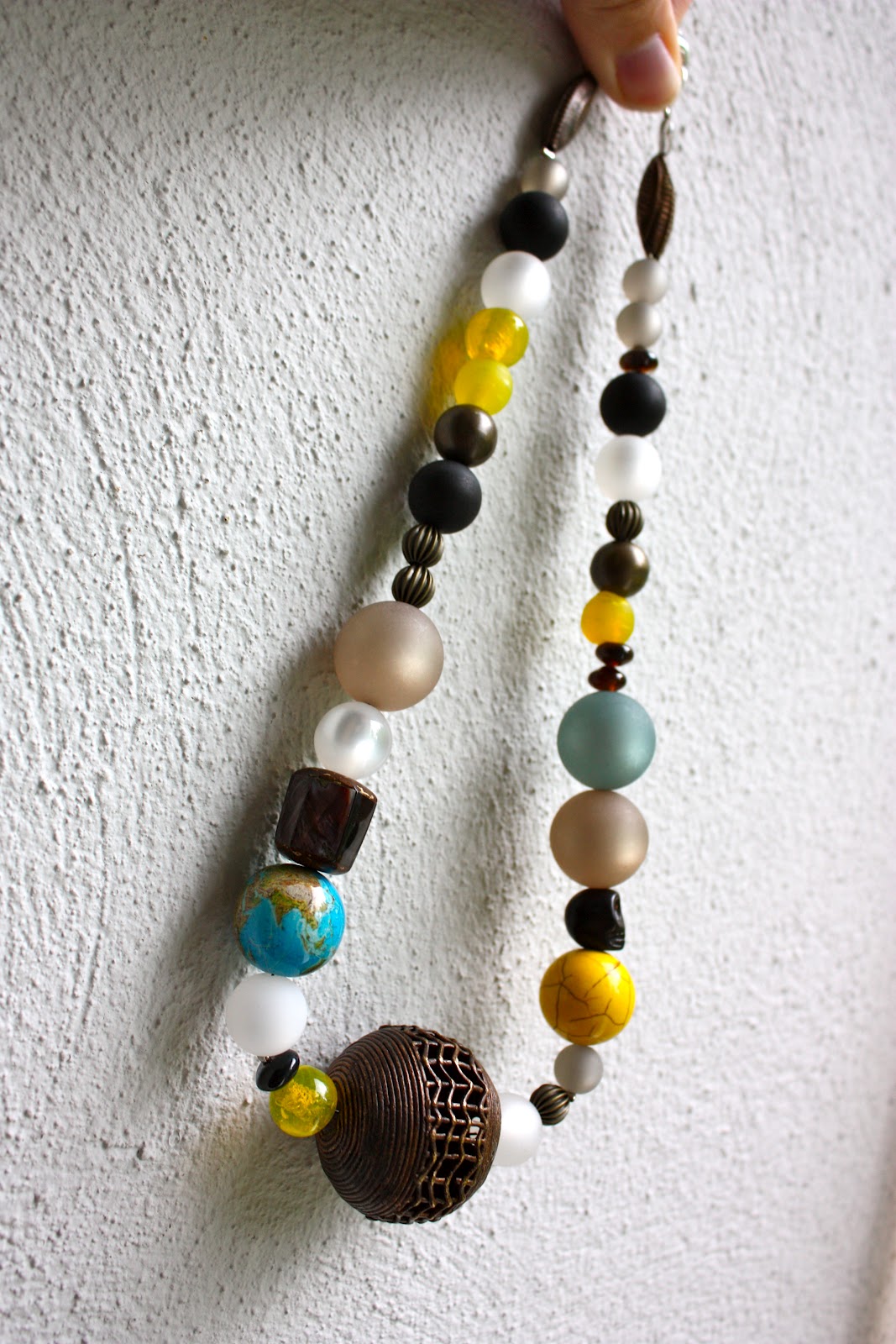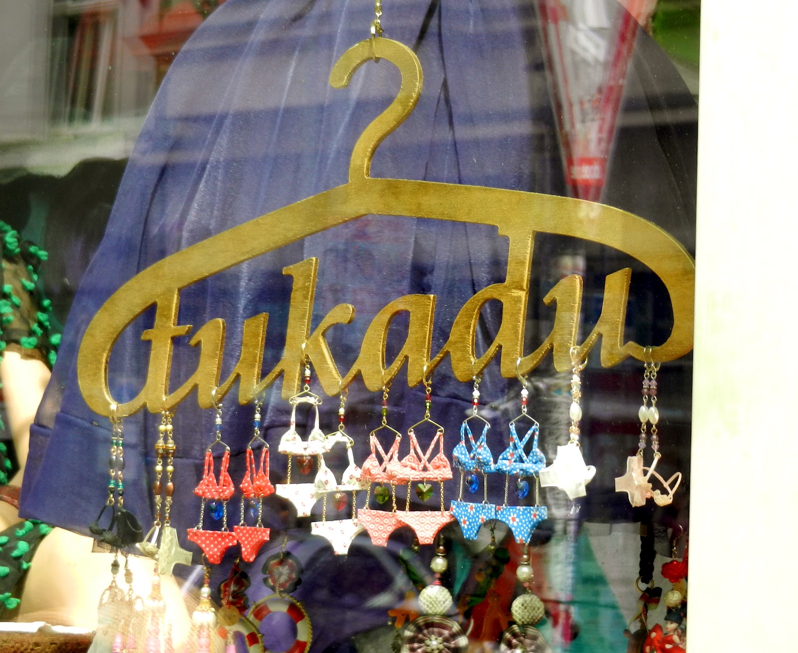 Tukadun helmikaupan valikoimiin kuuluu kaikkea mahdollista ja mahdotonta, mitä ihminen vain voi keksiä ripustavansa koruun. Olin bongannut Mitten Tukadun jo aiemmalla reissullani, mutta en silloin jäänyt ostostelemaan täyteen ammuttuun liikkeeseen. Mutta en tiennyt, että Tukadussa voi myös tehdä koruja paikan päällä, ennen kuin ystäväni vinkkasi Kemikaalicocktailin blogikirjoitukseen. Ystäväni teetätti itselleen käsilaukkuvieheen ja minä noukin laareista tarvikkeet muhkeaan Marokko-henkiseen kaulakoruun. Siitähän tuli vieläpä ihan toimistokelpoinen.