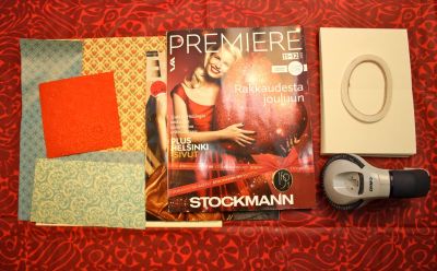 Leikkaa lehdistä kaikki kynttilän kuvat. Voit leikata myös muita jouluisia kuvia. Jättäisin ehkä alusvaatekuvat leikkaamatta, vaikka niitäkin joululahjavinkkeinä kovasti mainostetaan. Leikkaa nätistä paperista tausta kynttilälle. Teippaa kynttilän kuva nätille paperille ja tämä setti edelleen korttipohjalle. Niksuttele Dymolla jokin jouluinen tervehdys, jos koet sen tarpeelliseksi.