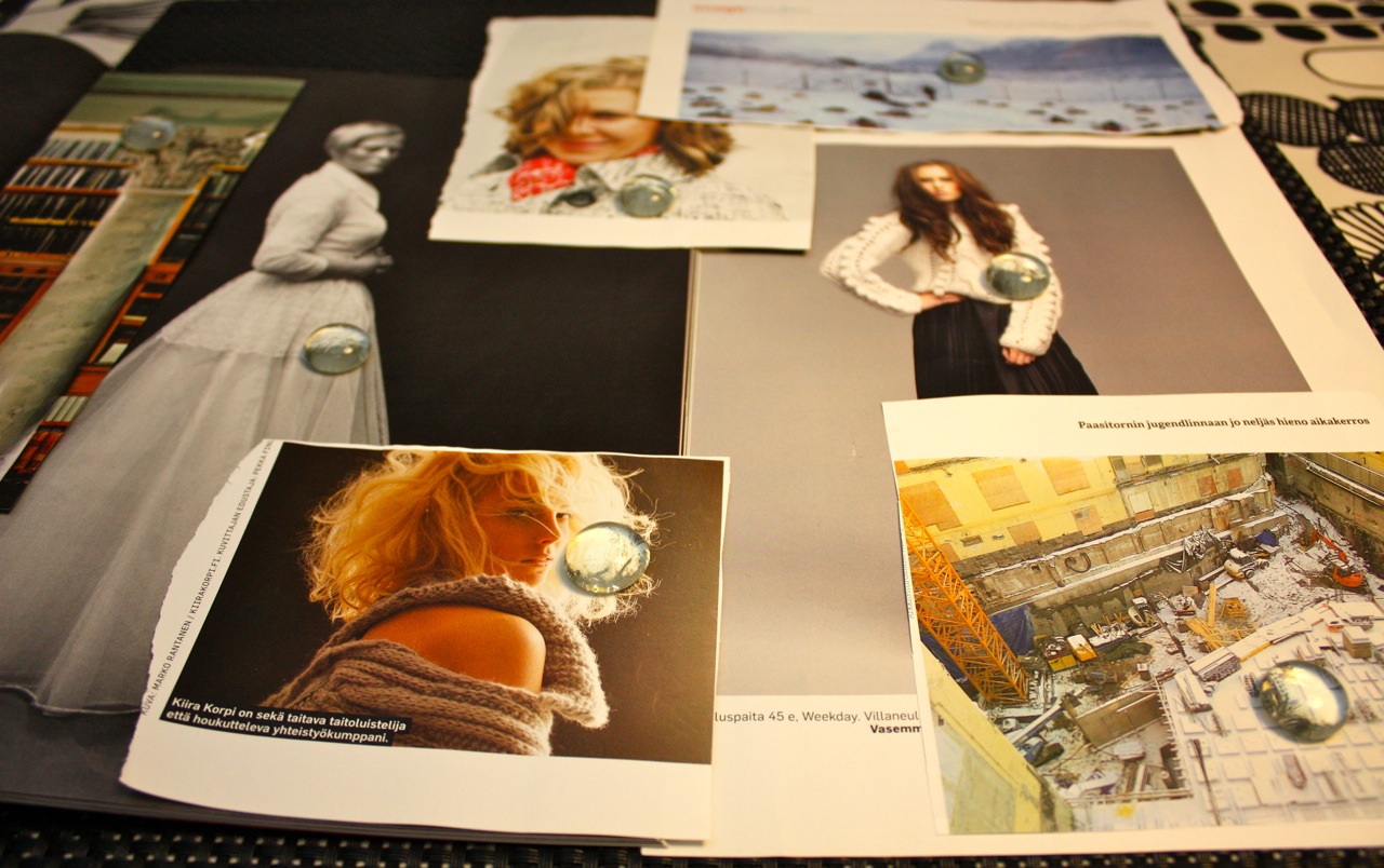 Mallaile lasipisaroiden avulla lehtikuvista sopivia valkoisia yksityiskohtia. Piirrä lyijykynällä pisaran ääriviivat haluamasi kohdan ympärille. Leikkaa ääriviivojen sisältä.