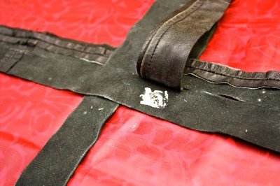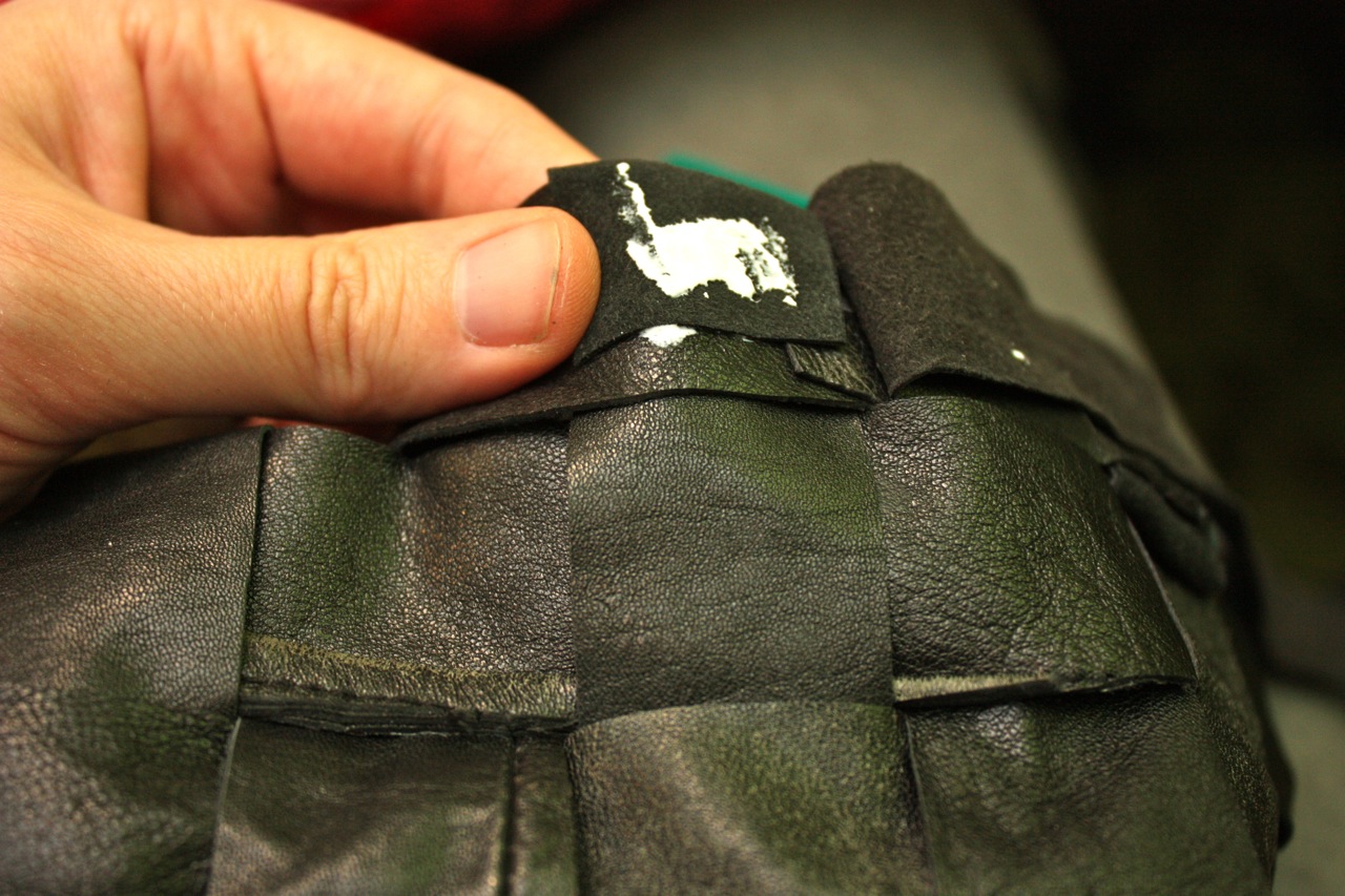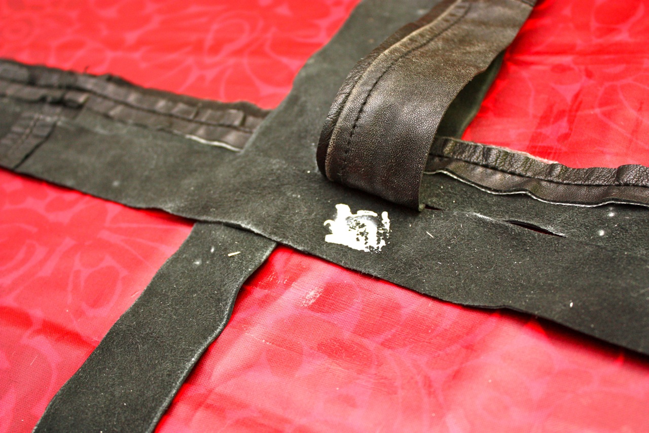 Tarvitset: Paksua nahkaa (tai mitä tahansa rispaantumatonta paksuhkoa kangasta, esim. huopaa), liimaa, sakset. Lisäksi: Mittanauha, klemmareita, liitu.