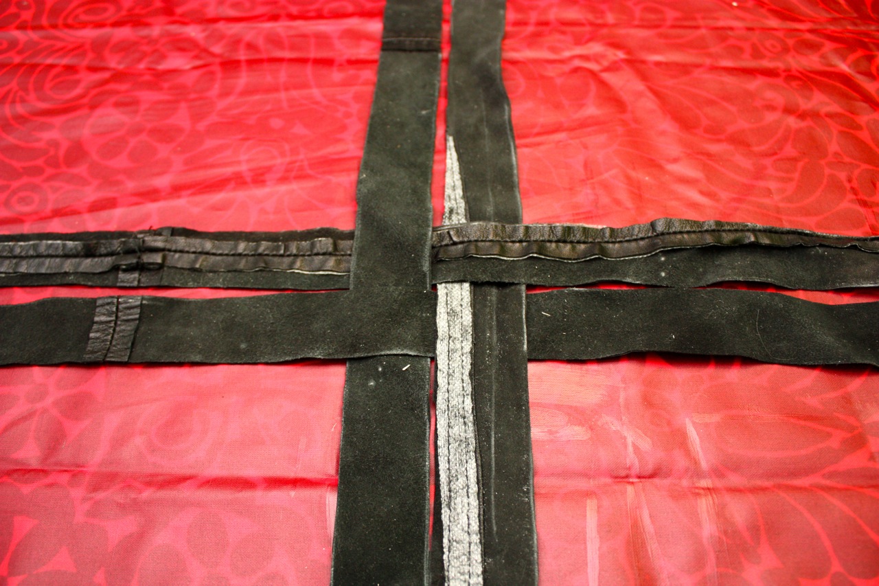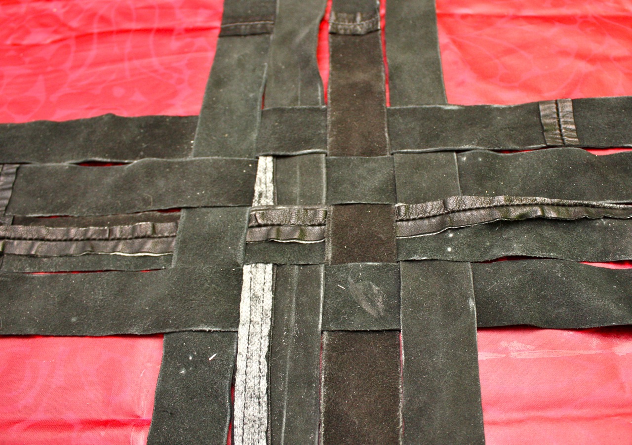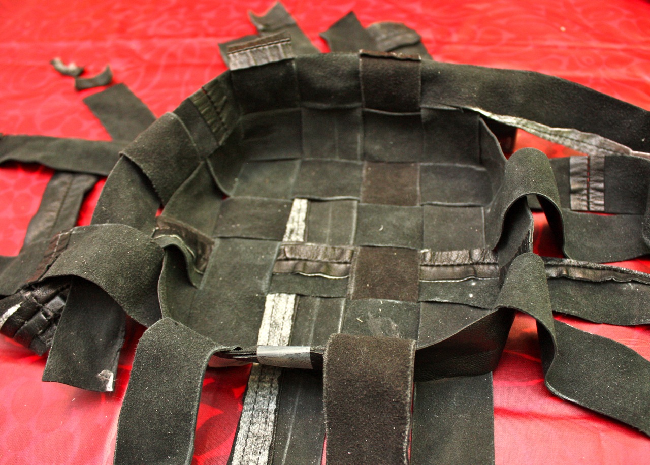 Sitten tulee vaikein osuus, varsinkin jos käytät pehmeäksi kulunutta nahkaa (kun sanoin tarvikelistassa ”paksua nahkaa”, tarkoitin sitä – tehkää niin kuin sanoin, älkää niin kuin tein): pyöräytä alimmainen panta ympyräksi. Tuo joka toinen pohjasta lähtevä suiruhäntä pannan sisään ja jätä joka toinen ulkopuolelle. Sulje panta klemmarin avulla (mulla ei ollut klemmareita, käytin teippiä ja pyykkipoikia ja meinas mennä vaikeaksi).