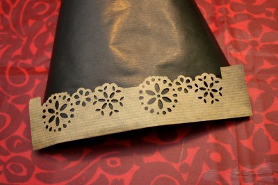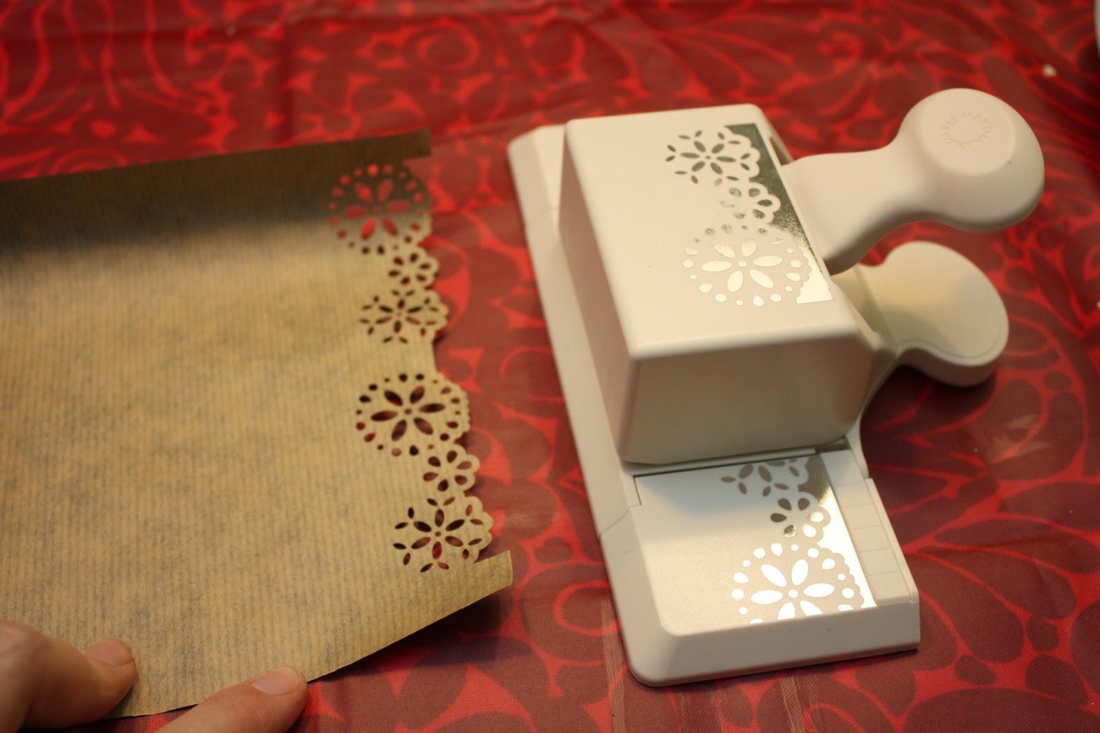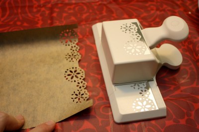Tehdään ensin pieni paketti. Rei’itä koristelävistäjällä lahjapaperin reuna.