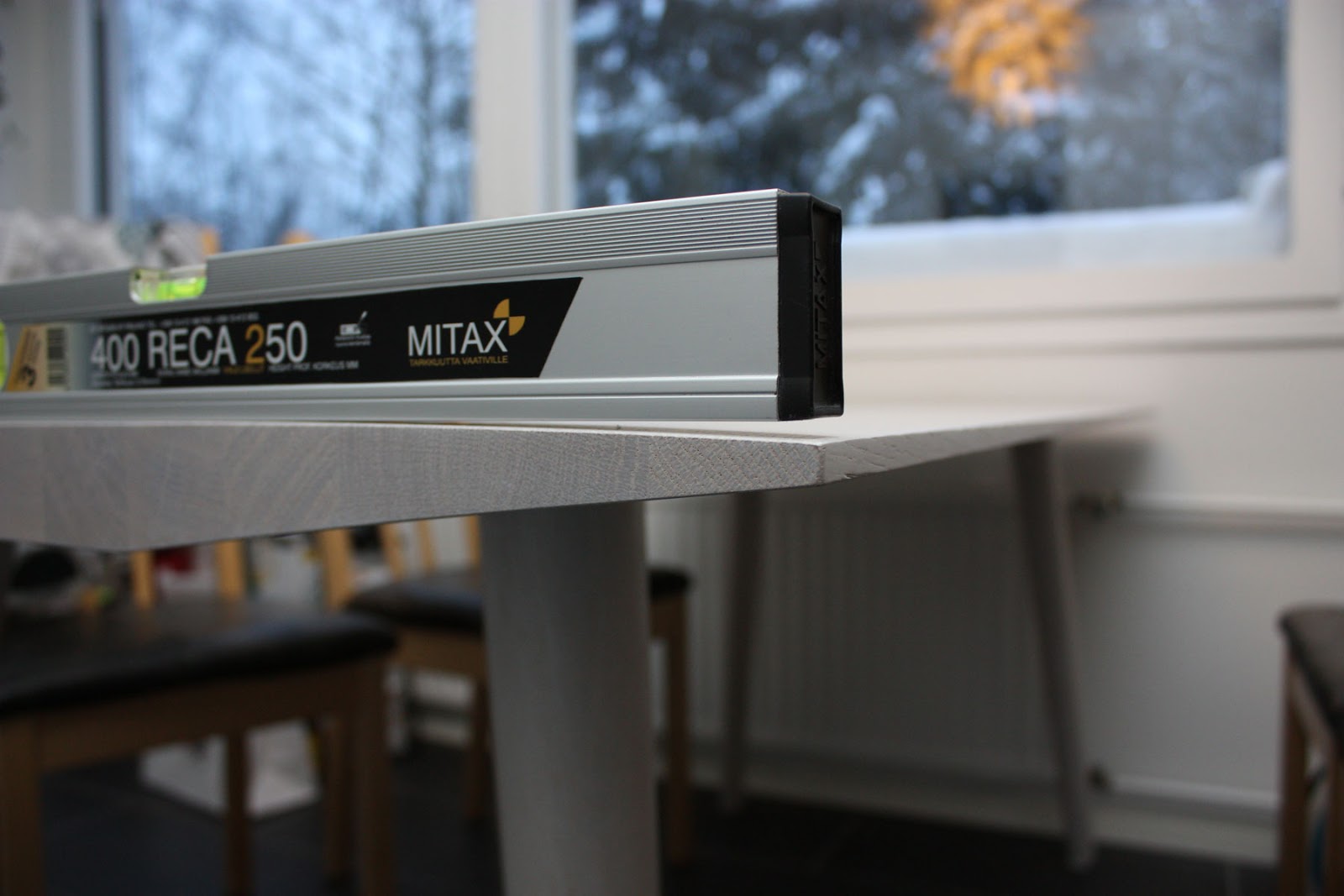Laskun maksettuani ehdin jo ajatella, että loppu hyvin, kaikki hyvin. Joulukuun aikana pöytämme ääressä istui enemmän ystäviä kuin koko syksynä yhteensä – mikä oli ihanaa! Joululounasta syödessämme aloimme kuitenkin ihmetellä, miten lautasemme klenkkaavat pöydällä. Ajattelin ensin, että lautasemme ovat kieroja; mutta mitenkäs posliini nyt yht’äkkiä muutaman vuoden käytön jälkeen kieroontuisi. Tarkempi syynäys ja vatupassaus osoitti, että pöytälevy oli alkanut vetäytyä kieroon tämän noin kuukauden aikana, jonka pöytä oli meillä ollut. Puun kuivatuksessa tai varastoinnissa oli täytynyt tapahtua jokin virhe, sillä eihän kuivan massiivipuun kuuluisi vääntyä propelliksi normaalissa huoneenlämmössä.
