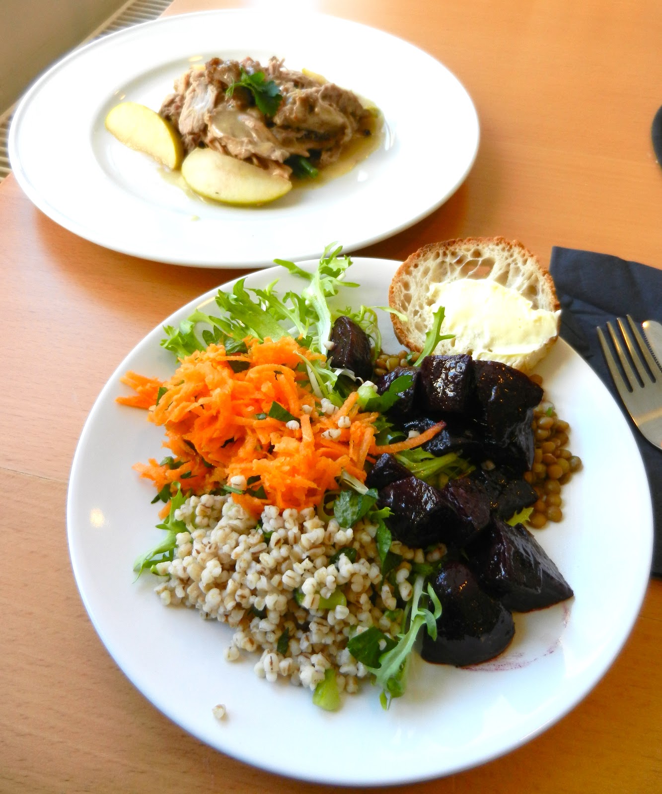 Lisukepöydän antimet kuulostivat minkä tahansa lounasruokalan tarjoomalta: vihreää salaattia, porkkanaraastetta, punajuurta, linssisalaattia ja ohraa – mutta erityisellä twistillä. Porkkanaraasteessa oli vivahde vietnamilaista makua, linssisalaatti vei kielen mennessään ja vihreät lehdetkin olivat laadukkaan rapeita. Ja leipä… taivaallista! Helsingin parasta patonkia, ehdottomasti.