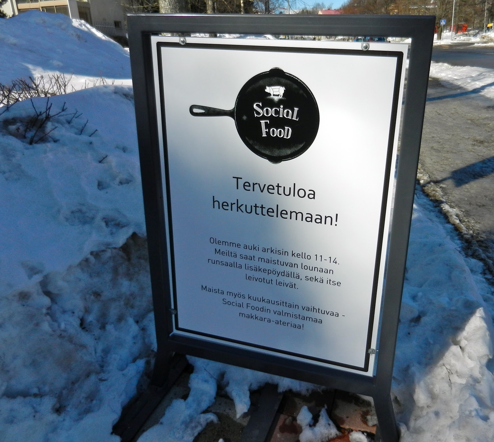 Social food on muutaman Master Chef -kilpailijan lounasravintola Käpylässä. Ravintola on todellakin lounasmesta, se ei ole auki iltaisin. Ruoka on maukasta ja rehellistä: maksakastiketta, nyyhtöpossua ja kuukausittain vaihtuva makkara-annos. Nyyhtöpossu omppulohkoilla oli mainiota ja suussa sulavaa – ”lusikalla syötävää”, kuten ystäväni asian ilmaisi.