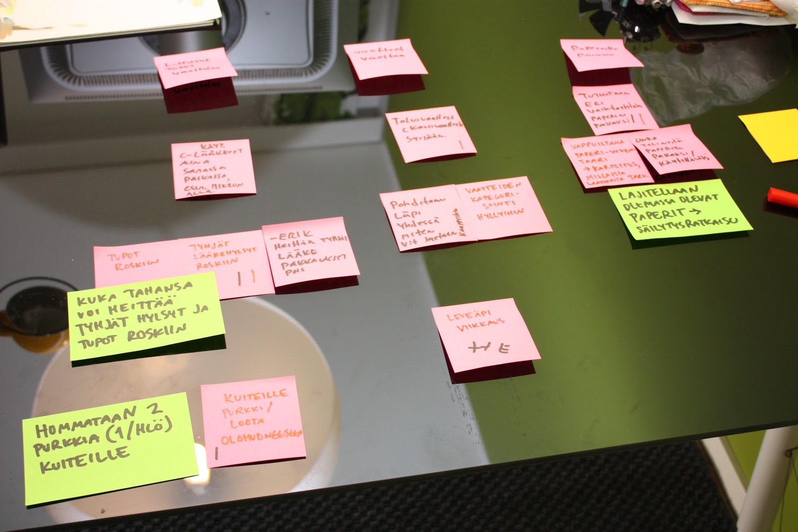 5. Kukin saa käyttöönsä kaksi ääntä: mitä deltaryhmää lähdemme muuttamaan kohti parempaa seuraavan kahden viikon aikana? Äänemme hajaantuvat täysin ja menevät tasan. Käymme pienen neuvonpidon ja annamme itsellemme kaksi lisä-ääntä, jotka merkkaamme tukkimiehen kirjanpidolla lappuryhmään. Lähdemme siis pureksimaan paperiensäilytysongelmaa, seilaavia paperitolloja ja vaeltelevia vaatteita. Ja kumpikin on nyt sitoutunut näihin kolmeen, vaikka kaikki omasta mielestä akuutimpiakin ongelmia saattaisi olla.