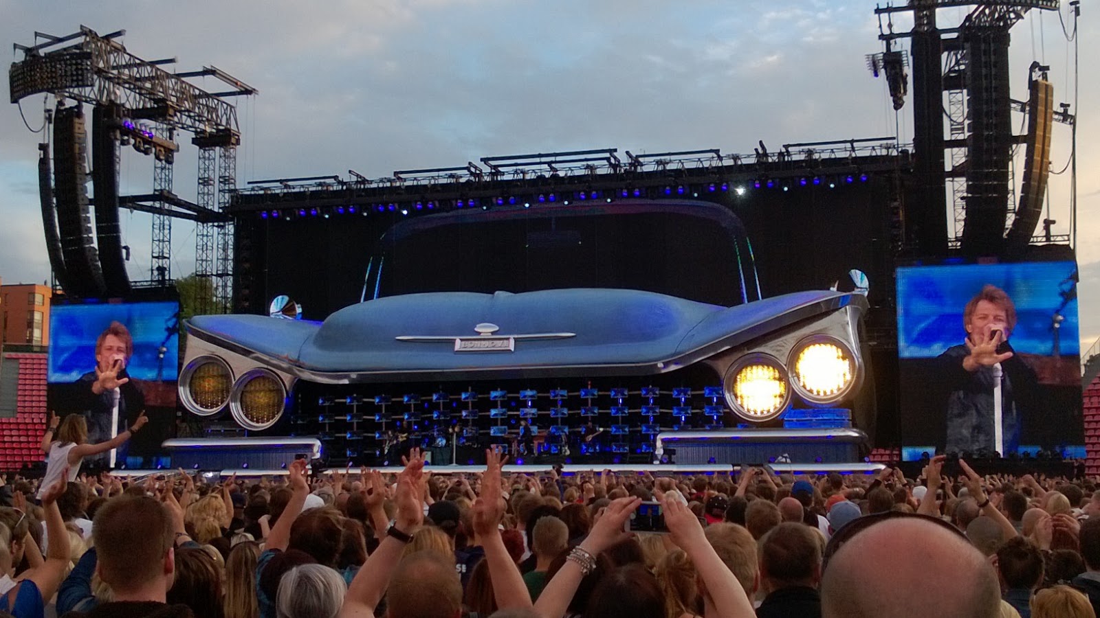 Paria minuuttia yli kahdeksan lavaste-cadillacin valot syttyivät ja Bon Jovin ukkelit kiipesivät lavalle. Seurasi tuttuja biisejä ja tuntemattomia biisejä. Soundi oli aika juurevaa – sellaista jenkkimusaa, jota säestetään yhtä aikaa sekä akustisella että sähkökitaralla ja jonka musiikkivideossa ajetaan Ameriikan halki avoautolla tukka hulmuten. Sellaista vähän keski-ikäistä ja vähän Brucemaista. Hyvä, letkeä meininki ja varma ote jatkui läpi setin.