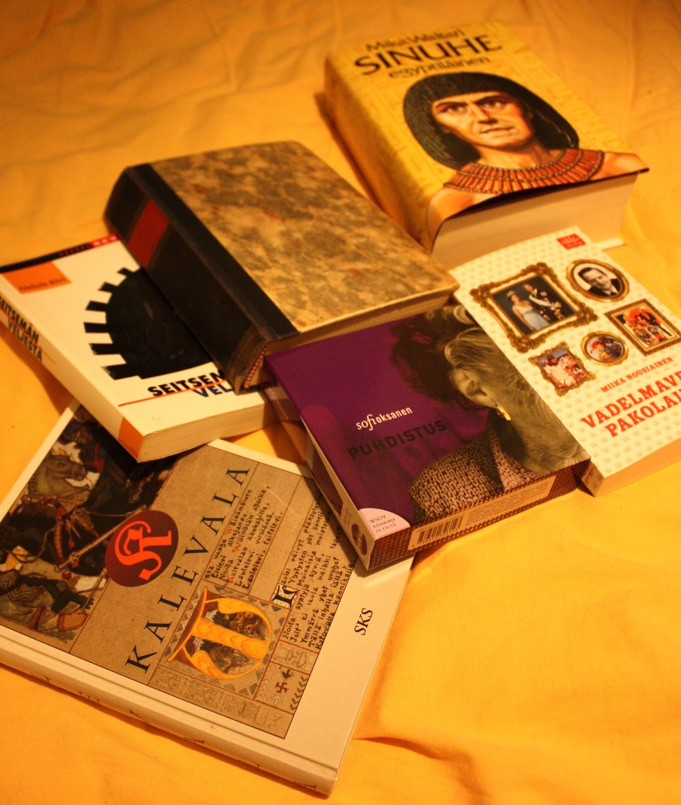 Kirjat ovat herättäneet tähän mennessä ristiriitaisimpia luopumisen tunteita. Minut on kasvatettu kunnioittamaan kirjoja, joten niistä luopuminen tuntui aluksi sivistyksen häväistykseltä. Mutta mitä tekee sivistyksellä hyllyssä, eikö sen pitäisi olla päässä tai sielussa tai missä se nyt sitten fyysisesti sijaitseekaan? Valtaosa omistamistani kirjallisuuden klassikoista sai siis lähteä – järkeilin, että ne saa lainattua kirjastosta, jos niitä haluaa lukea. Ainoat hyllyyn jääneet klassikot olivat Sinuhe (siitä pidän oikeasti) ja Kalevala (se vaan on niin friikin hieno).