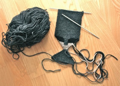 Elikkäs ota pääväri ja luo 26 silmukkaa. Neulo 3 kerrosta aina oikeaa. Rupea kaventelemaan 2 yhteen aina kummassakin reunassa joka toisella kerroksella kettupuuhkan ohjeen mukaan. Jatka kaventelua, kunnes jäljellä on 4 silmukkaa. Neulo vielä neljän silmukan ”nurjan puolen kerros” (tämä näkyy jo alla olevassa kaaviokuvassa toiseksi alimmalla rivillä).