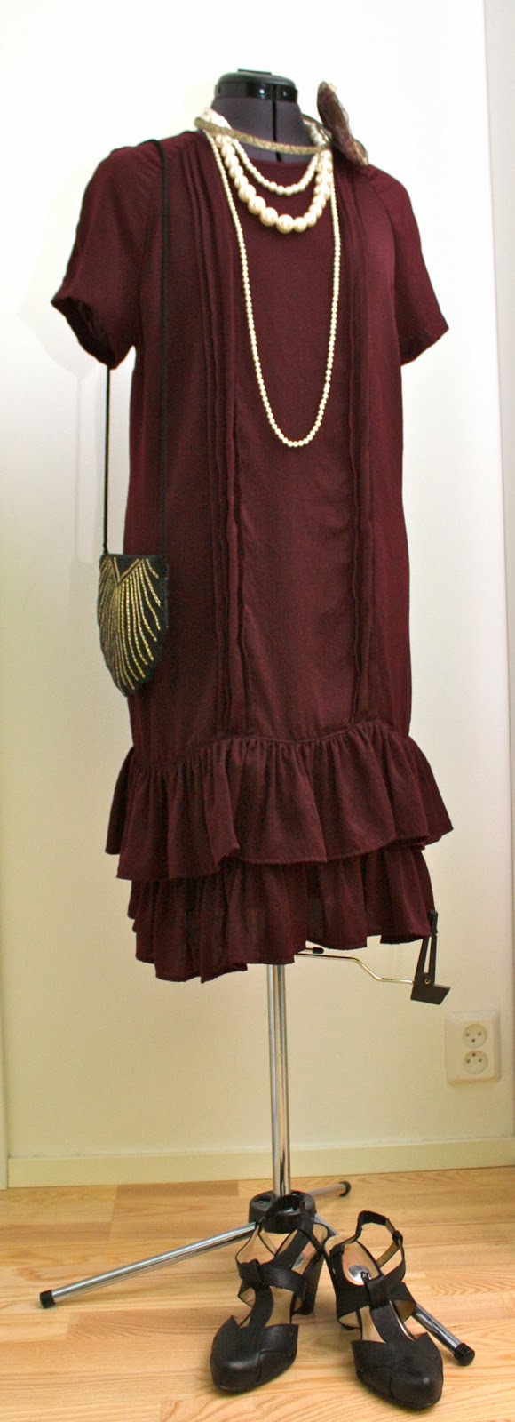 Helmet olivat täyttä rihkamaa, hommattu aikoja sitten jostain ruotsalaisesta halpavaateketjusta ja palvelleet ties kuinka monissa kemuissa, niin TKK 100 vuotta -juhlassa kuin mafiateemaisissa pikkujouluissakin. Kukallinen pääkoriste on itse tehty, näpersin sen Great Gatsby -teemaisiin polttareihin.