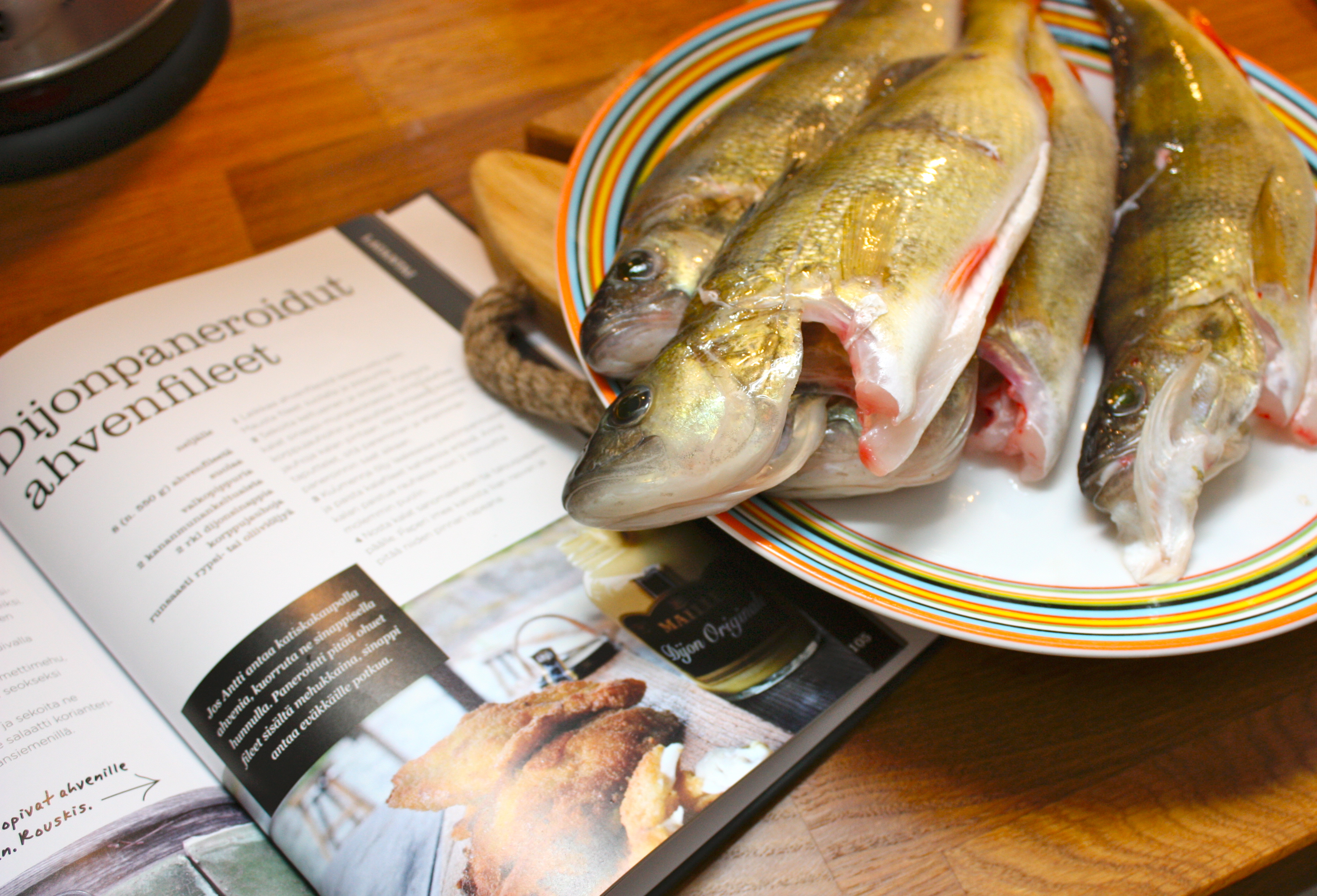 Hommasin Safkaa 2 -keittokirjan, koska tykkäsin ykkösosan resepteistä niin paljon. Tänä viikonloppuna päätin korkata kirjan, ja ensimmäiseksi ohjeeksi valikoitui sinappihunnutetut ahvenfileet kera japanilaisen kurkkusalaatin. Suunnitelma töksähti heti kalatiskillä, kun ahventa ei ollutkaan tarjolla kuin kokonaisena. Takanani kiemurtelevan pitkän jonon vuoksi en hennonnut pyytää myyjääkään fileoimaan. No, en tästä lannistunut, vaan ajattelin, että nytpä olisi oivallinen tilaisuus opetella veitsen käyttöä. Ei muuta kuin YouTube auki ja opetusvideota kehiin – näinhän me diginatiivit asioita opimme.