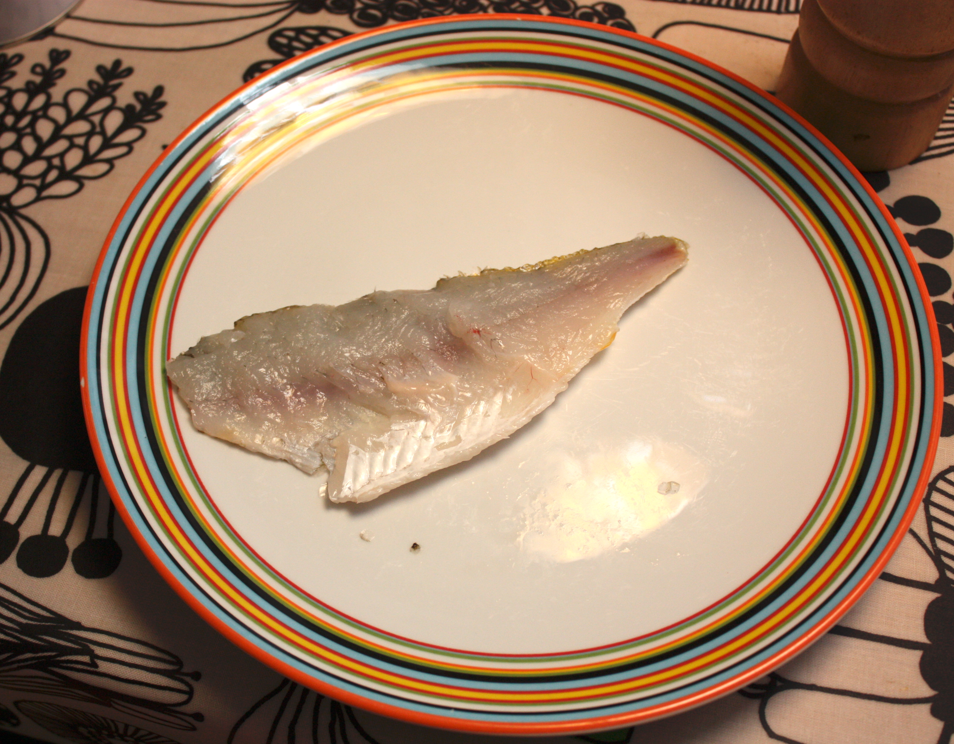 Seuraavaksi tuikkasin veitsen kylkievän juureen ja koitin tehdä samanlaisen ranneliikkeen kuin YouTuben kalamestari. Silkkaa luuta vastassa. Muutaman runnovan liikkeen jälkeen sain veitsen oikeaan asentoon ja pääsin irroittamaan filettä. Lopulta kylki erottui selkäruodosta, mutta lihaa siinä oli aika hintsusti. Laskeskelin, että jos koitan veistää nahan vielä irti, niin ”fileeseen” jää lihaa ehkä reilu teelusikallinen. Neljä kalaa kahteen pekkaan, siis ehkä 2 rkl fisua per lärvi… kyllä siinä nälkä jää.