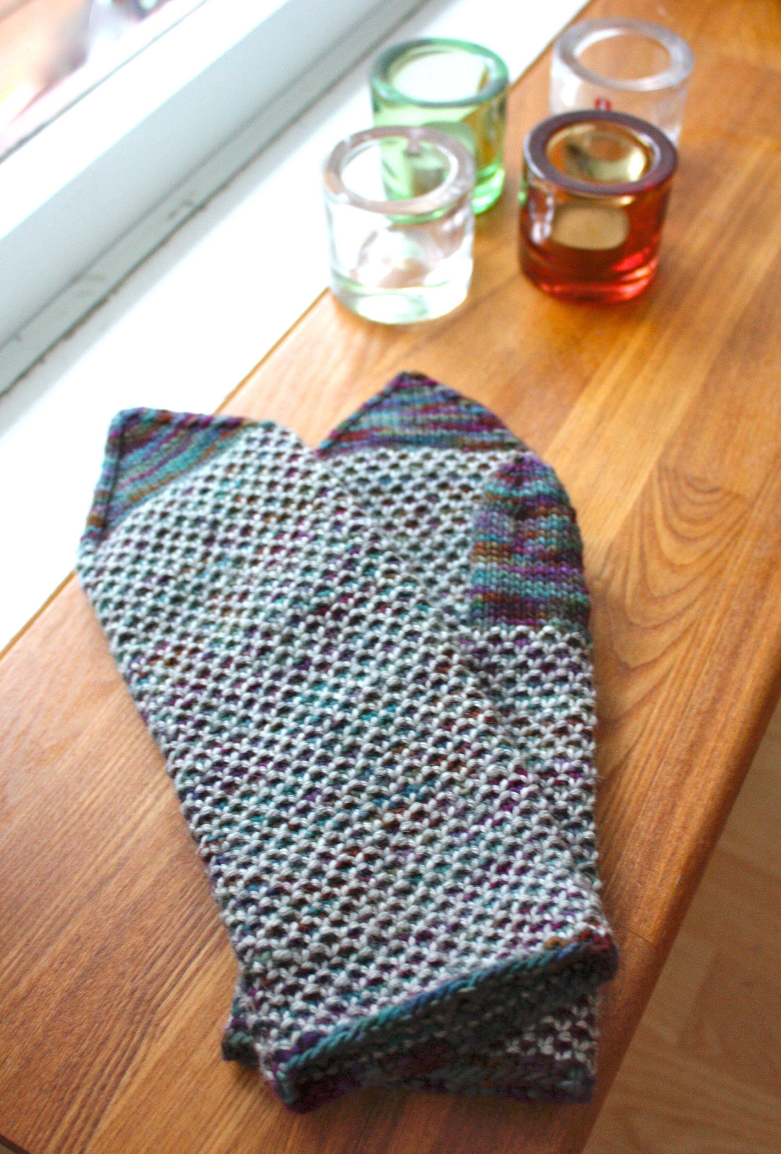 Neule oli itse asiassa paljon simppelimpi kuin lopputulos antaa ymmärtää: Joka toinen kerros neulotaan yksivärisellä langalla, joka toinen pätkävärjätyllä. Yksiväriset kerrokset posotetaan aina oikein, pätkärääkätyillä kerroksilla nykerretään helmineuletta. Puikot saa olla vähän alakanttiin mitoitetut langan paksuuteen nähden, sillä tiiviimpänä neulepinnasta tulee kauniimpi, jotenkin suomuisempi.