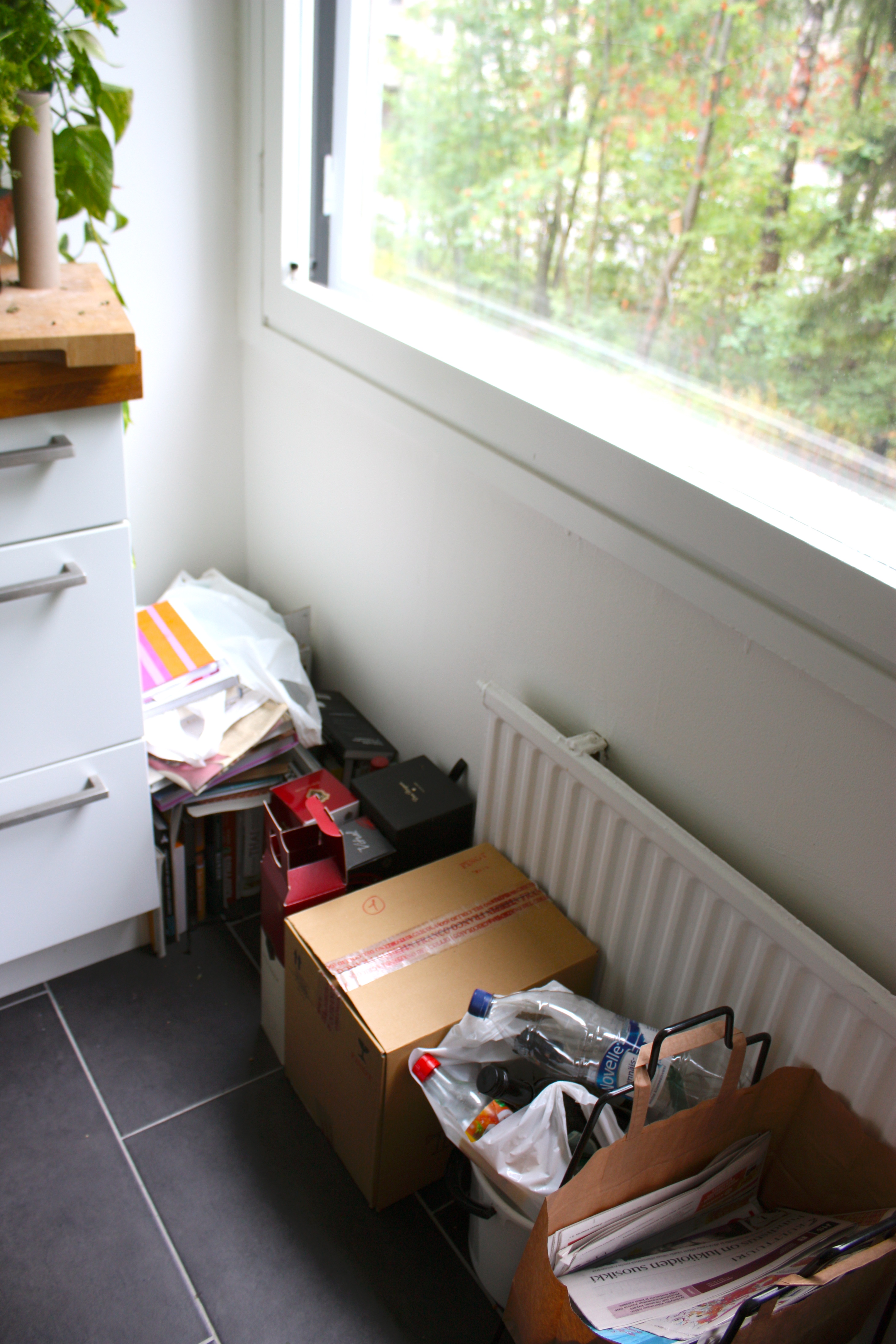 Valtaosa viinipulloista löysi paikkansa jääkaapin päältä kaapista, loput moduulihyllykön takaa. Punkkua muuten riittää vähäksi aikaa. Puoli metriä keitto- ja leivontakirjoja lähti odottamaan kirpparia, säilytettävät sijoitin upouuteen hyllyyn. Paperinkeräys saa minun puolestani hengailla edelleen nurkan läheisyydessä, kunhan käyttäytyy siivosti. Metallijäte viedään pihan uutukaisiin keräilyastioihin saman tien, kun niitä syntyy. Tyhjille pulloille on ehkä keksittävä vielä parempi paikka, mutta olkoon toistaiseksi ämpärissä lehtien vieressä. Kävipä lopulta helposti, kunhan otti vaan asiakseen.