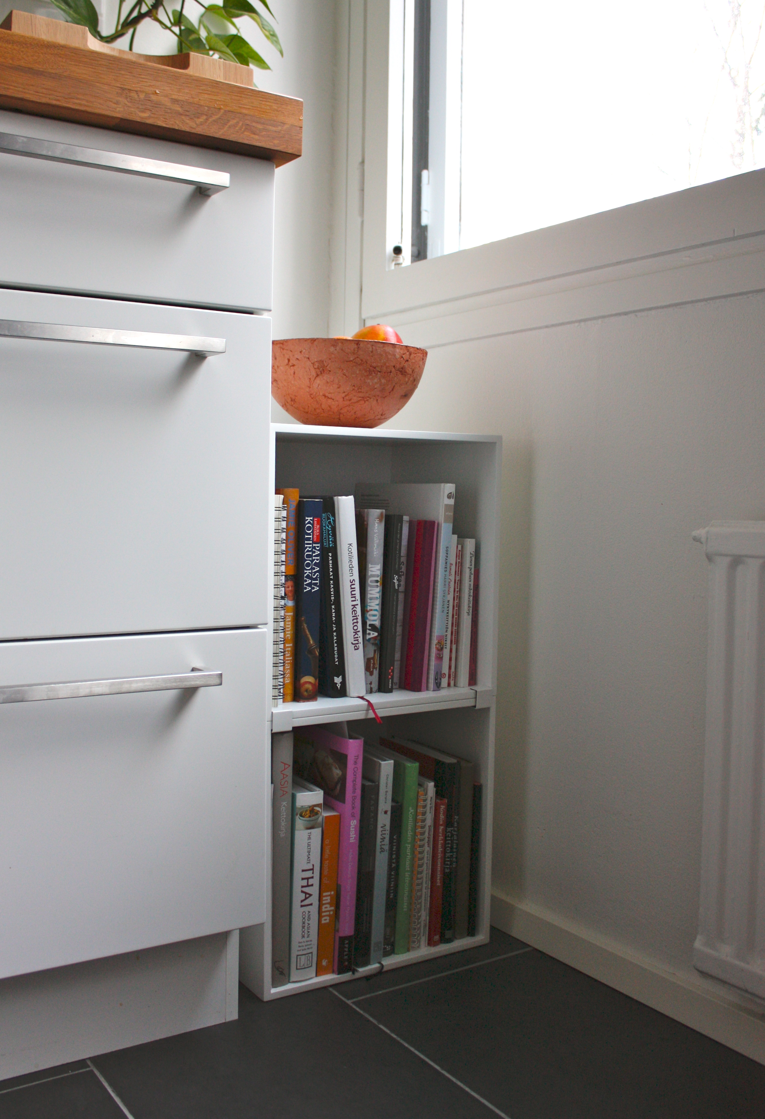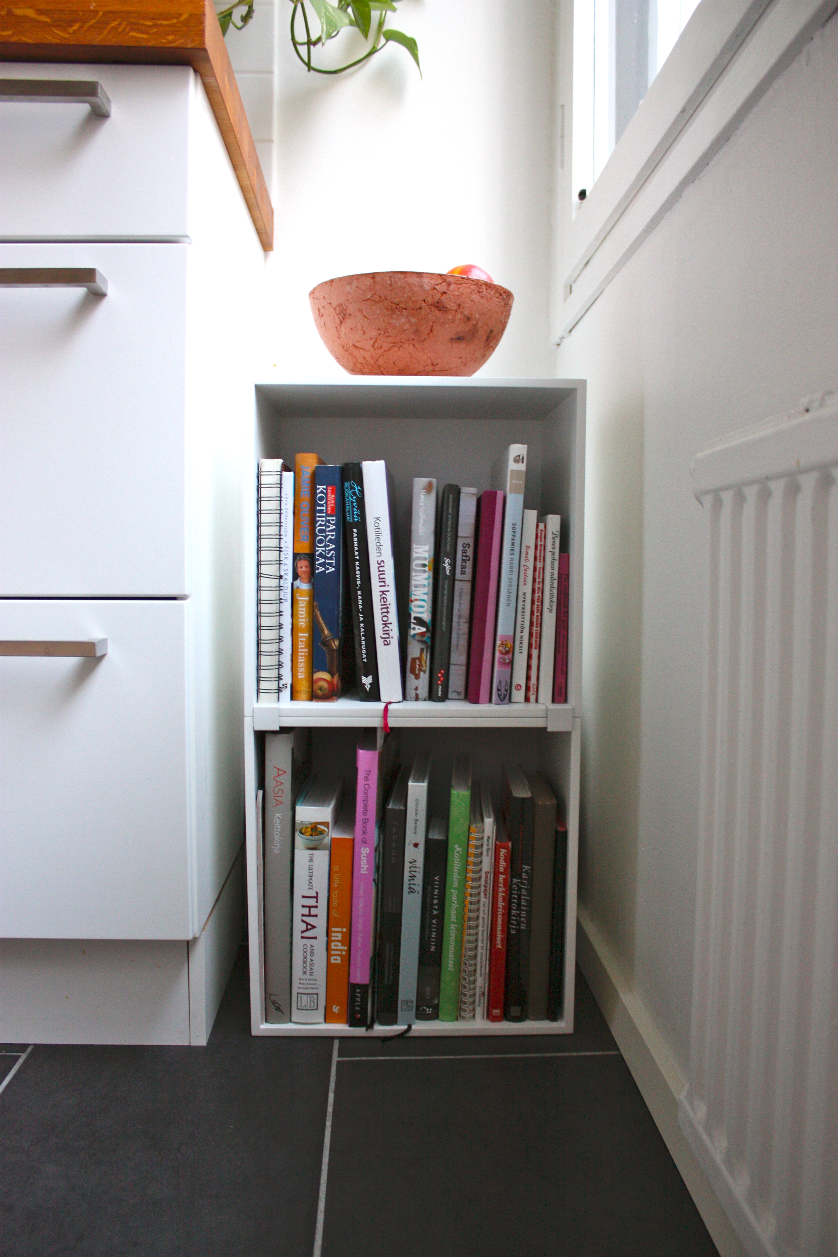 Samaiset Palaset-laatikkovibat tuli tuosta laatikosta! Hyvä idea järkätä keittokirjat keittiöön, silloin ainakin potentiaalinen käyttöaste on korkeampi kuin pitämällä keittokirjat vierashuoneessa, kröhöm… Mutta miksi kirjat eivät ole koko- tai värijärjestyksessä hyllyssä? Vai onko niillä joku muu looginen järjestys? 🙂