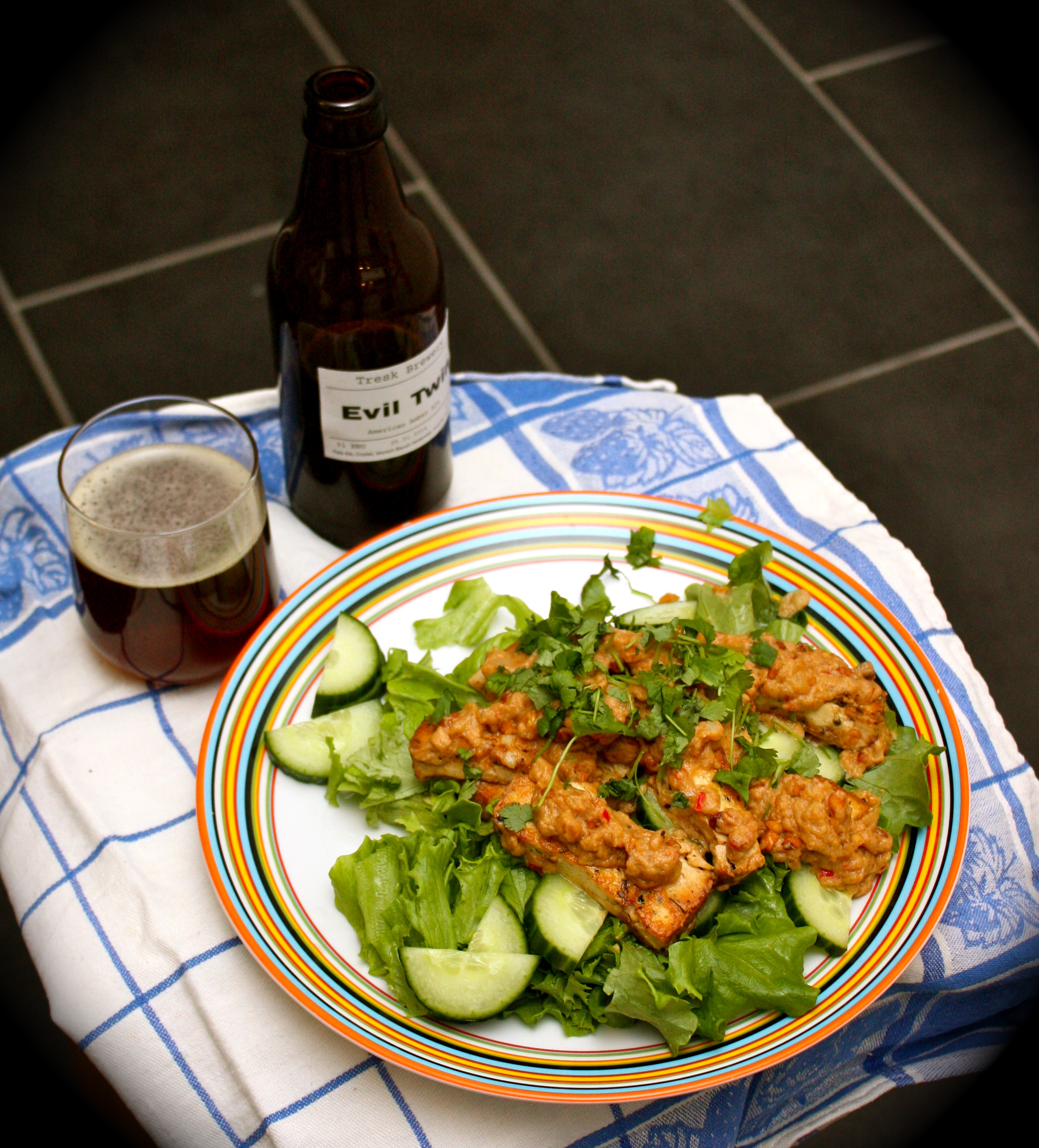 No, pelkkä satayhan ei vielä ketään lämmitä, joten tavitaan proteiinia. Alen suositteli kanaa tai possua, mutta minä päätin kokeilla tofua. Mulla ei ole hirveästi kokemusta tofusta, joten valitsin ihan vaan summan mutikassa Jalotofun marinoidun tofun, jonka viipaloin, paistoin pinnalta ja heitin kastikkeen sekaan. Lisukkeeksi en jaksanut käydä keittämään nuudeleita, joten revin vaan salaattia lautaselle, pilkoin kurkkua ja hölväsin vähän riisiviinietikkaa – ja iskin tofusatayn salaattipedin päälle. Päälle hakkasin vielä vähän korianteria. Mums. Tuli herkkua. Ei uskoisi kasvisruuaksi, eikä tofussakaan ollut yhtään sellaista ”pure Barbababaa” -fiilistä.