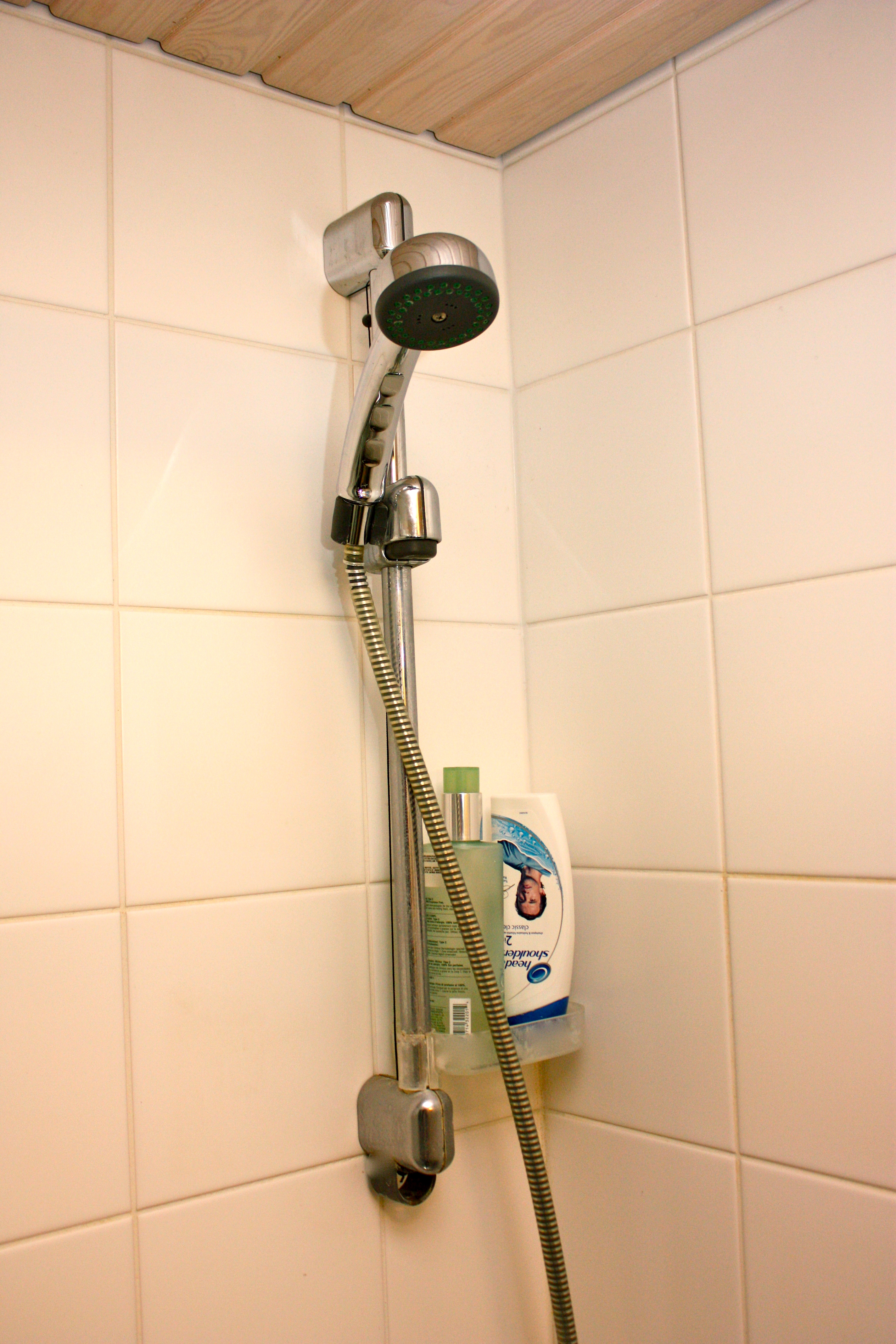 Pieni suihkukoppi (noin 0,8 m2), suihku, lattiakaivo. Suihkun tangossa 10 cm x 15 cm hylly. Tuo postikortin kokoinen hyllykouru on suihkunurkkauksemme ainoa säilytysratkaisu. Hyllylle mahtuu joko yksi palasaippua tai 2 kapeaa pesuainepulloa.