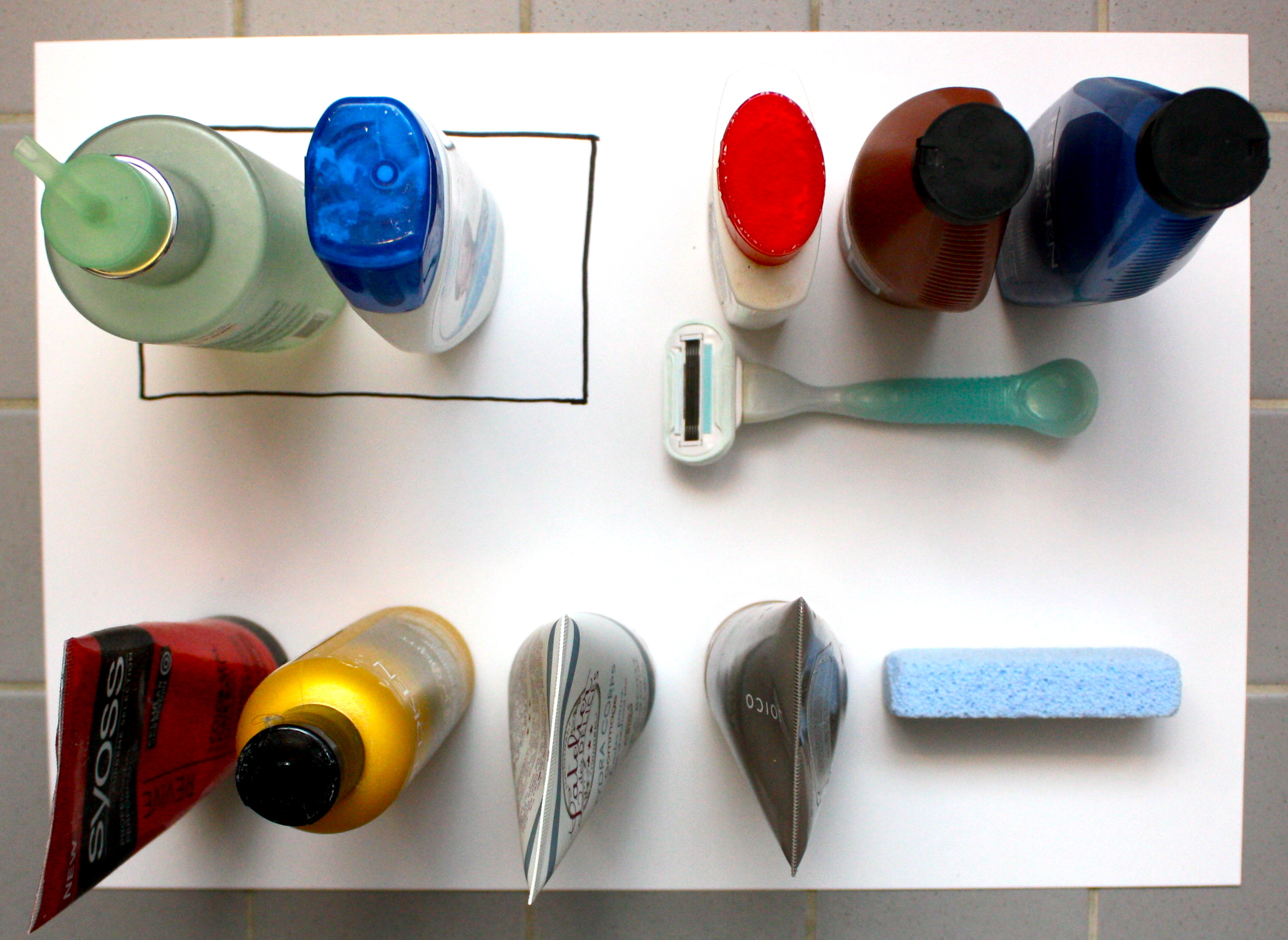 Tässäpä vielä A3-paperin päälle koottu havainnollistus säilytystilan tarpeesta meidän kylppärissämme. Musta nelikulmio kuvaa nykyistä suihkunurkan säilytystilaa. Ylärivin kamat ovat lähes päivittäin käytettäviä asioita, must-have suihkukopin sisällä. Alarivin systeemit ovat nice-to-have, siis hieman harvemmin tarvittavia. Niitä olen valmis säilyttämään lavuaarin yläpuolella peilikaapissa, toisella puolella kylppäriä.