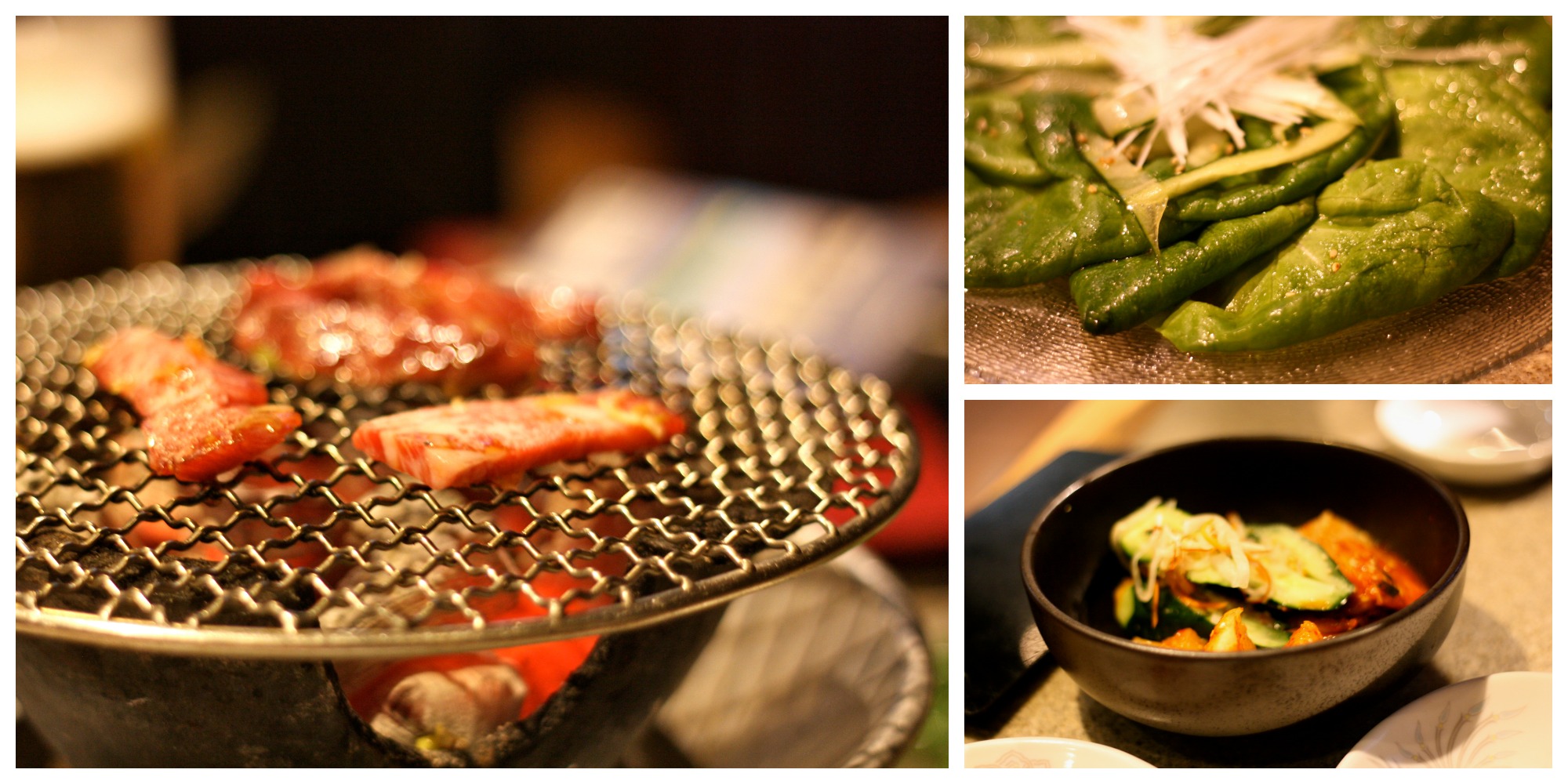 No mitä me sitten söimme, jos emme sushia? Yllättävän paljon lihaa. Reissun parhaat annokset olivat raakoja, marmoroituja lihapaloja, jotka kannettiin pöytään liekehtivän grillin kera. Lihoja sai tiristellä pöytägrillissä suunmukaisiksi. Tiristetyn lihan kanssa syötiin salaattia, vihanneksia, sieniä, pikkelöityjä kasviksia tai kimchiä. Toisinaan liha oli ulkofilettä, toisinaan entrecotea, joskus paistia, kerran myös kieltä – mutta aina se oli herkullista.
