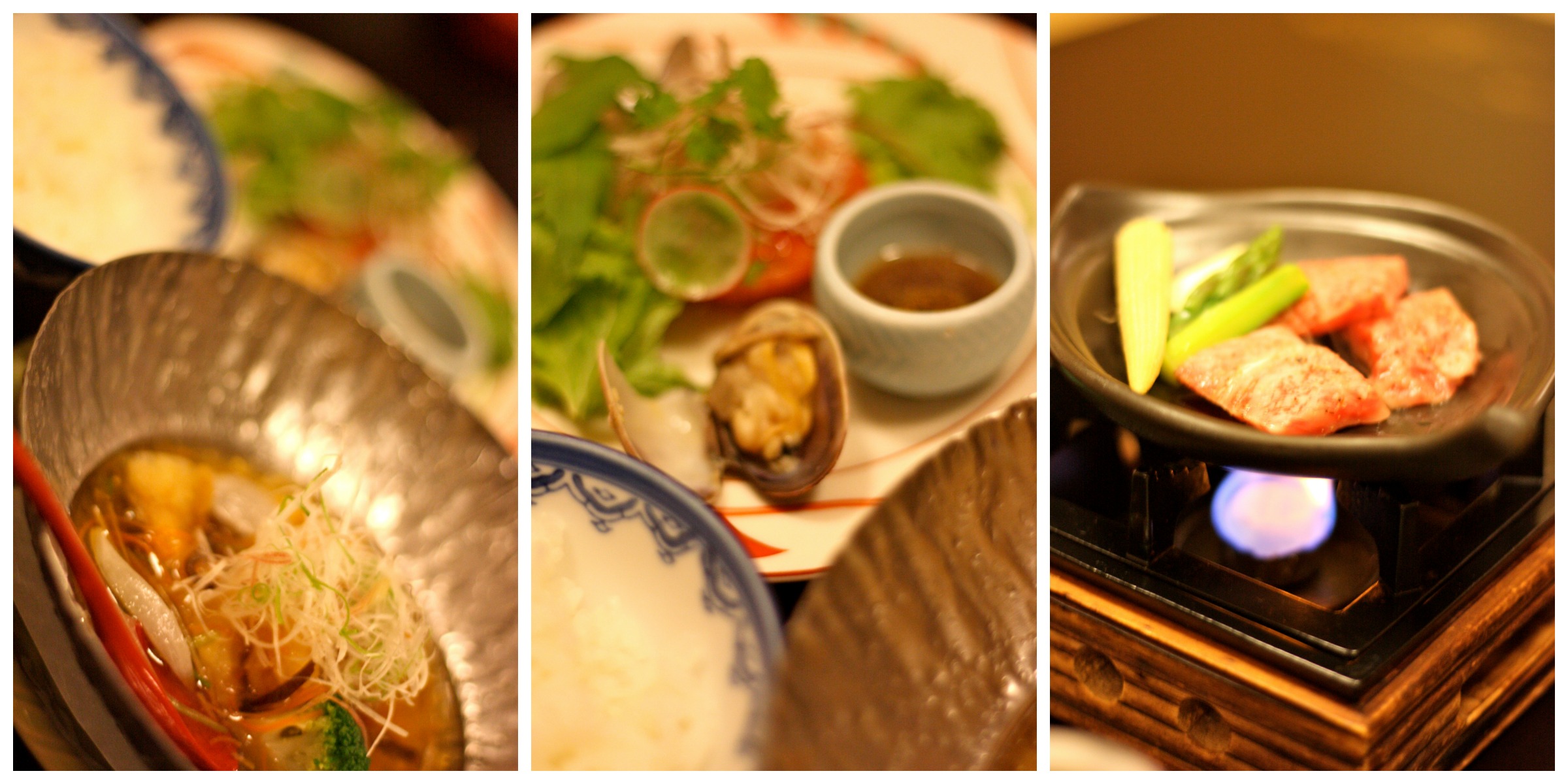 Muutamalla lounaalla liha/kala/kana, riisi ja lisukkeet oli katettu meikäiseen tapaan yhdelle lautaselle, mutta useimmissa paikoissa ateria koostui pienistä, erillisiin kippoihin katetuista osasista. Ehkäpä övereimpänä esimerkkinä tästä oli majatalossa nauttimamme illallinen, jonka aikana eteemme tuotiin varmaan 20 erillistä pikkukupposta: kalaa, lihaa, riisiä, keittoa, tofua, mustekalaa, hyytelöä, vihanneksia, äyriäisiä, nilviäisiä ja vaikka mitä.