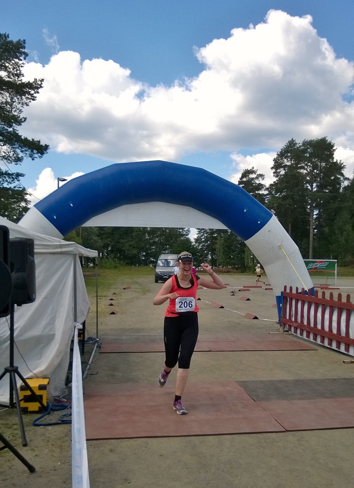 Kisaa edeltävänä iltana tankkasin vatsani täyteen risotolla ja pienellä lasillisella valkoviiniä. Kisapäivän aamiaisen (leipäpala, avokado, puuroa ja jugurttia) nautin 4 tuntia ennen starttia hieman normiaamupalaa tuhdimpana, ja 2 tuntia ennen lähtöä sipaisin vielä yhden riisipiirakan, sillä nälkäisenä juokseminen on vastenmielistä. Vettä siemailin koko aamun niin, että automatka Punkaharjulta eteenpäin taittui kupla tukevasti otsassa. Ennakkotankkaus oli mielestäni aika onnistunut. Tai siis enhän tiedä paremmasta, mutta ainakaan starttissa vatsa ei ollut liian täysi eikä nälkä alkanut murnia vatsassa.