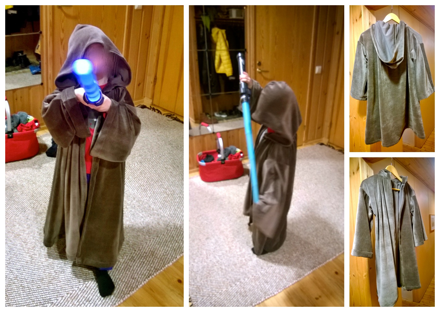 Kummipojan 4-vuotissynttäreitä vietettiin jo maaliskuun puolella. En päässyt varsinaisena synttäripäivänä paikalle, mutta onnistui se juhliminen näin jälkijättöisestikin. Olin hommannut jo hyvissä ajoin lahjaksi lasermiekan, ja ajatuksena oli etsiä siihen kylkeen ruskea kylpytakki – puoliksi käytännöllinen jediritarin kostyymi siis.