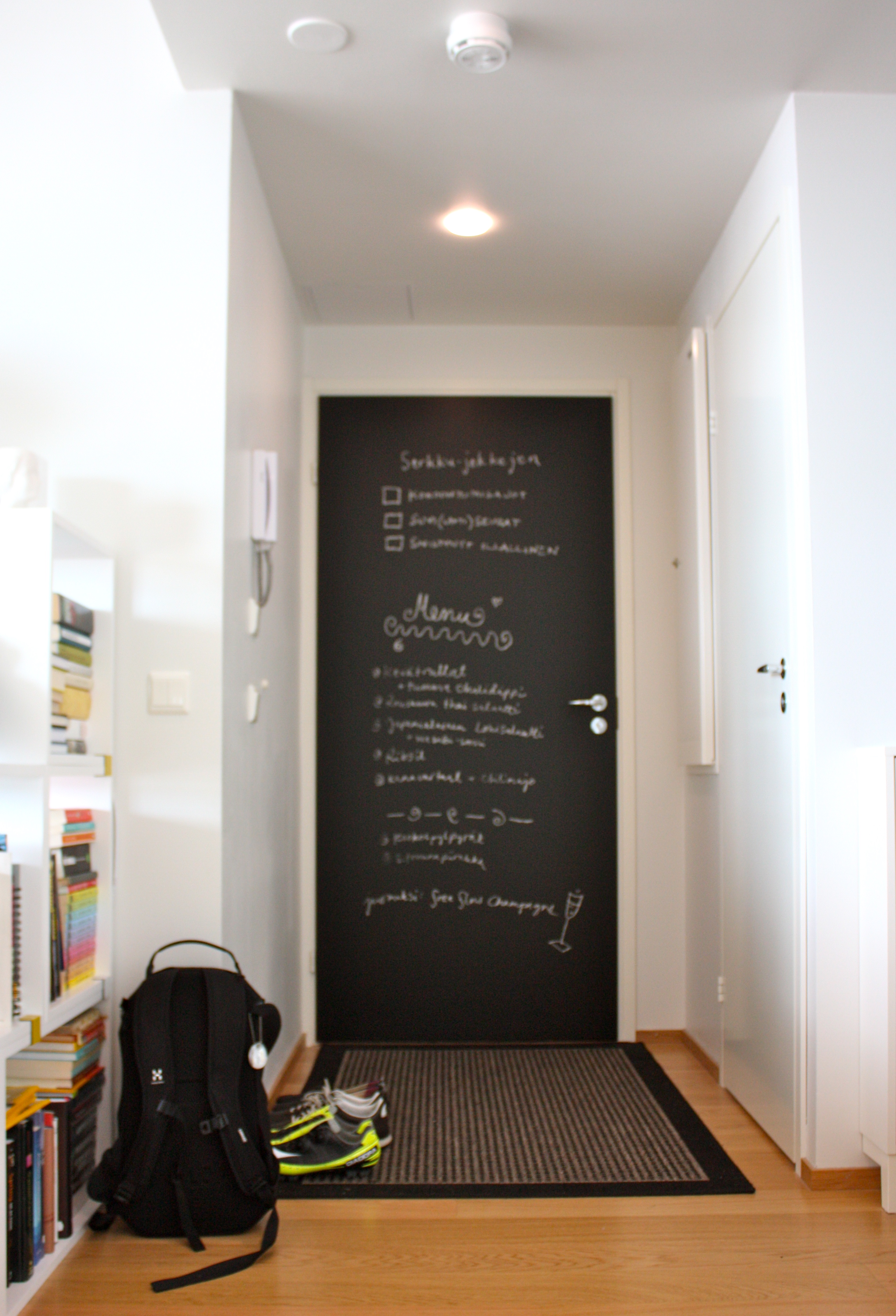 Toinen pieni kesäinen pintaremppakohde oli eteisen ovi. Alunperin tehdasmaalattu valkoinen ovi sai pintaansa kaksi kerrosta liitutaulumaalia. Alkuunsa mielessä kävi puolikkaan ajatuksen mittainen epäilys, että kannattaako kämpän pimeintä nurkkausta maalata mustalla, mutta kyllä kannatti. Selkeät kontrastit tuovat ryhtiä.