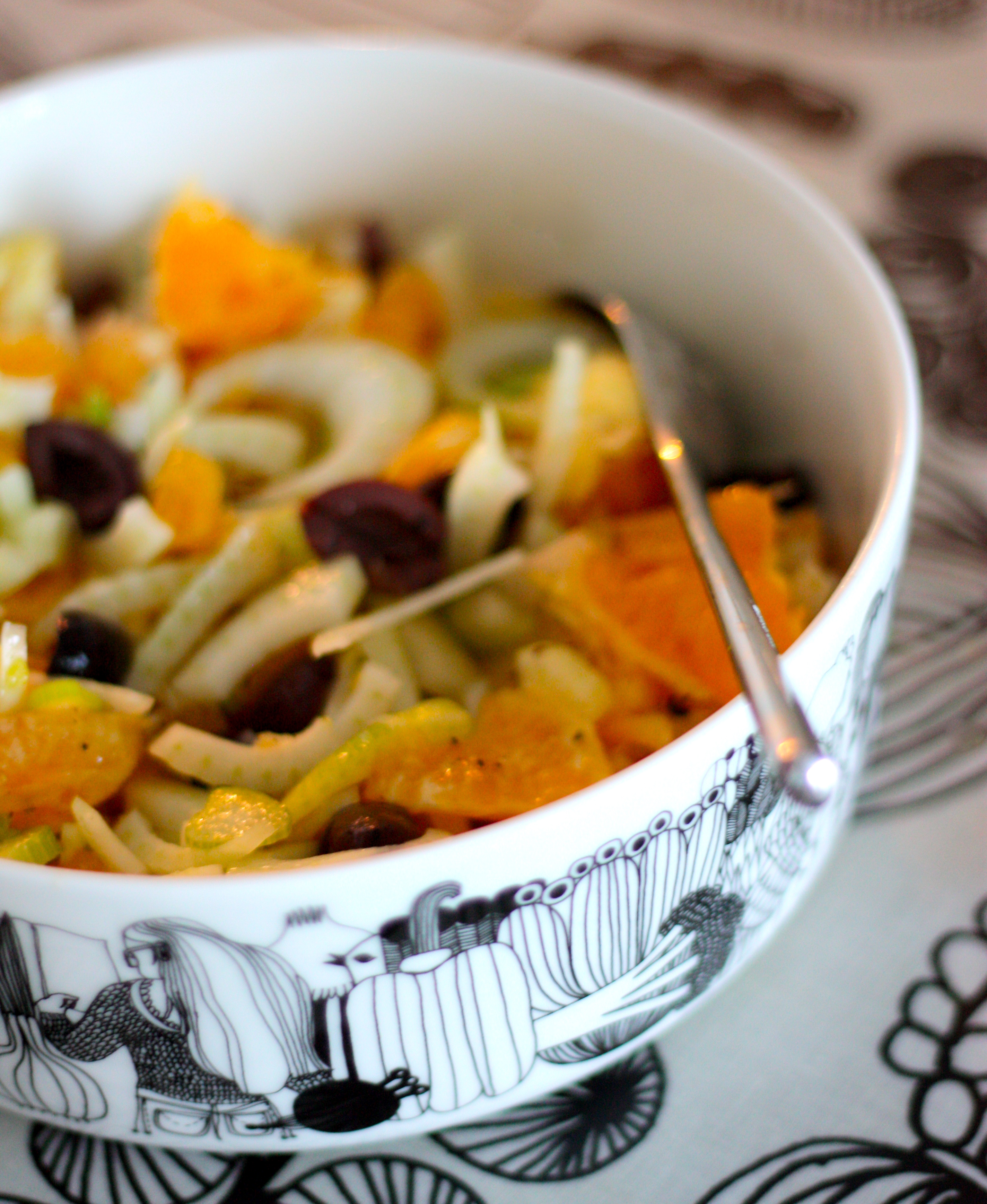 Nimittäin ihmisenhän on hyvä syödä reippaasti tuoreita vihanneksia. Olen suuri salaattien ystävä, mutta talvella perus kurkku-tomaatti-salaatti-sekoitus ei vaan oikein inspiroi. Liian mautonta, liian tavallista, liian luonteetonta. Yksi lemplilisukesalaateistani, joka kestää myös talvisesongin ankaruutta, on sisilialainen fenkolisalaatti. Ja se on vieläpä kaunista ja lämpöisennnäköistä, siis valon tuoja – eli täydellistä Lucian päivän murenta.