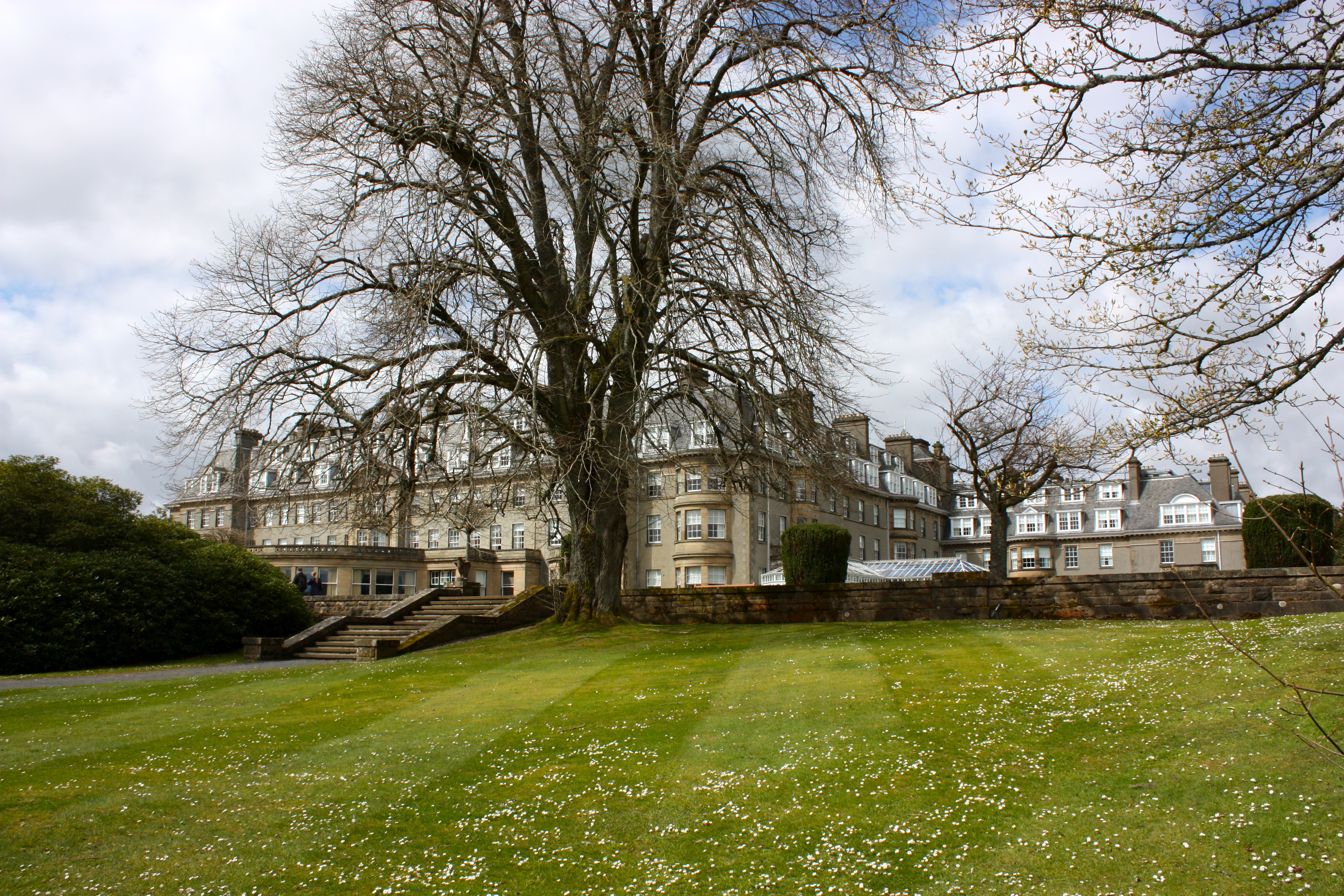 Gleneaglesin kartano oli nähtävyys jo itsessään. Henkilökunta oli superystävällistä (monilla miehillä oli kiltit), kylpyhuone ihana, sänky mukava ja ruuat herkullisia. Aamiaisella oli jopa tee-se-itse Bloody Maryn ainekset buffapöydässä; ei vaan Suomen alkoholilainsäädännöllä. Mutta kaikkein hienointa oli kartanon puutarhan maisemat, jotka aukesivat nummille päin. Golfaajat varmaan tykkäisivät kartanoa ympäröivistä golfkentistä.