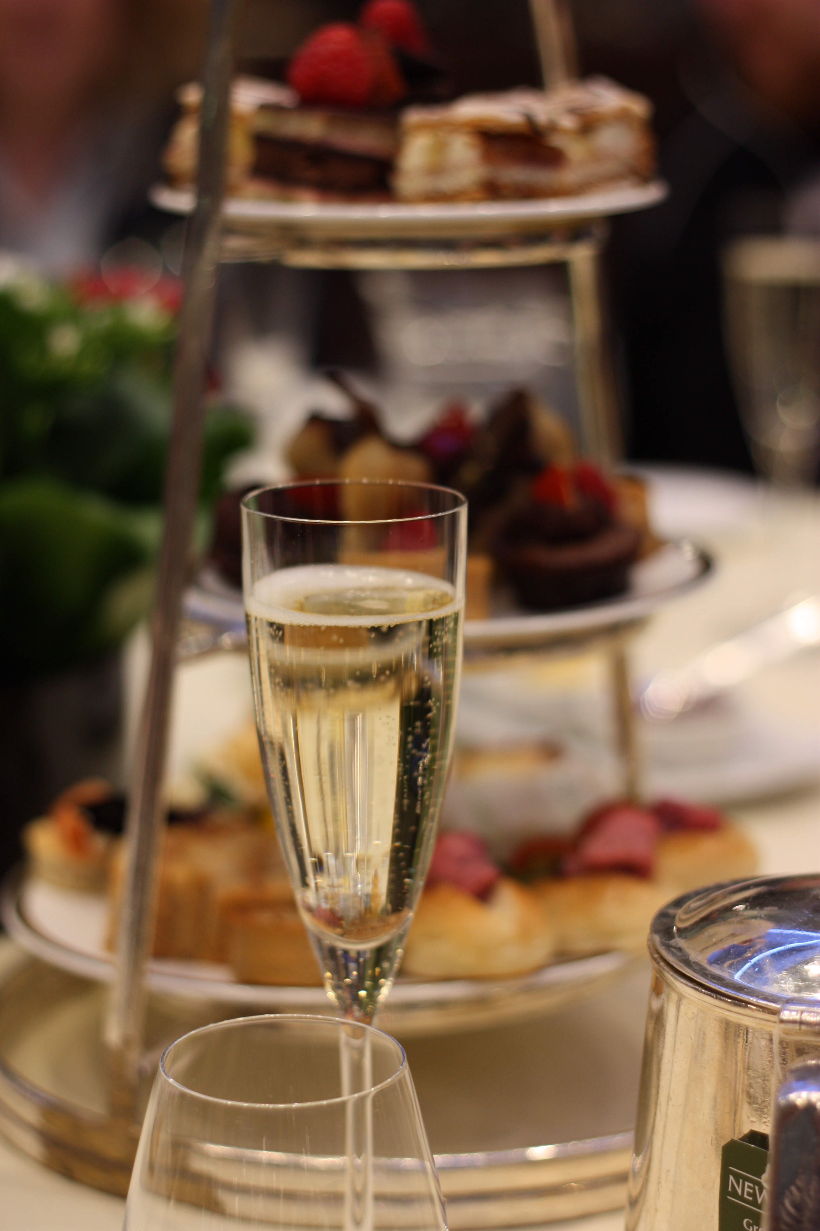 Iltapäivätee oli ihana kokemus. Teetä, kuohuviiniä ja kauniita pikkuherkkuja kolmessa kerroksessa. Alimmassa kerroksessa oli miniatyyrikokoisia suolaisia herkkuja: klassisia kurkkuvoileipiä, lohileipiä, tuulihattuja ja tulitikunmittaisia halkaisijaltaan olevia sipulipiirakoita. Keskikerroksessa olisi kuulemma usein skonsseja, mutta meidän teekattauksessa välitason muodosti vähemmän makeat sokerileivonnaiset: suklaakreemillä täytetyt munkit, vadelmajuustokakku ja muffinsit. Ylätasolla komeili övereimmät kakkupalat: vadelma-suklaa-kerroskakku ja aleksanterinleivokset. Skonsseja ja hilloa tarjoiltiin sitten vielä erikseen.