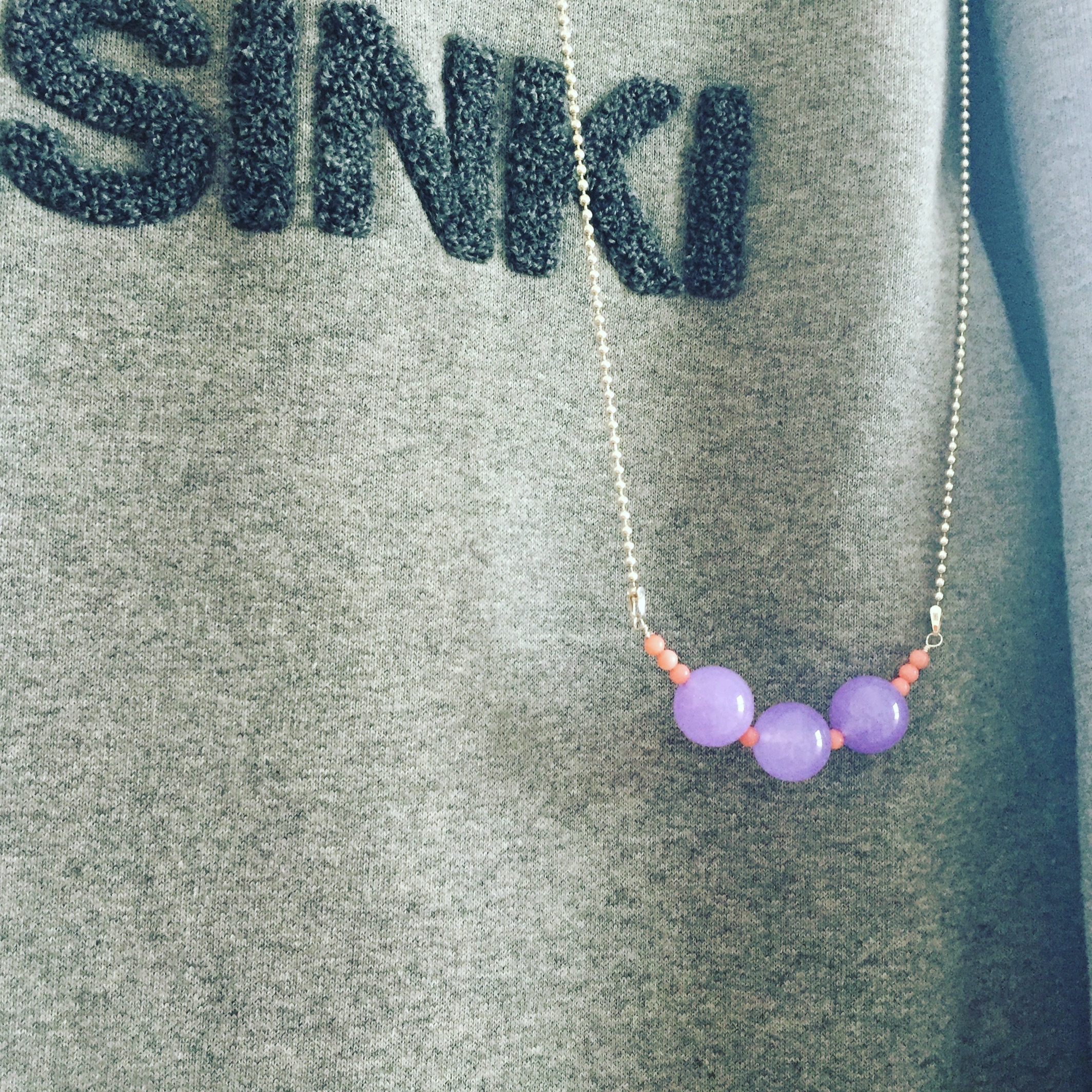 Tällainen karkkikoru siitä tuli. Onkohan tämä muuten sitä paljon puhuttua kiertotaloutta – violetit helmet ovat nimittäin entisessä elämässään jo kertaalleen palvelleet helminauhana.