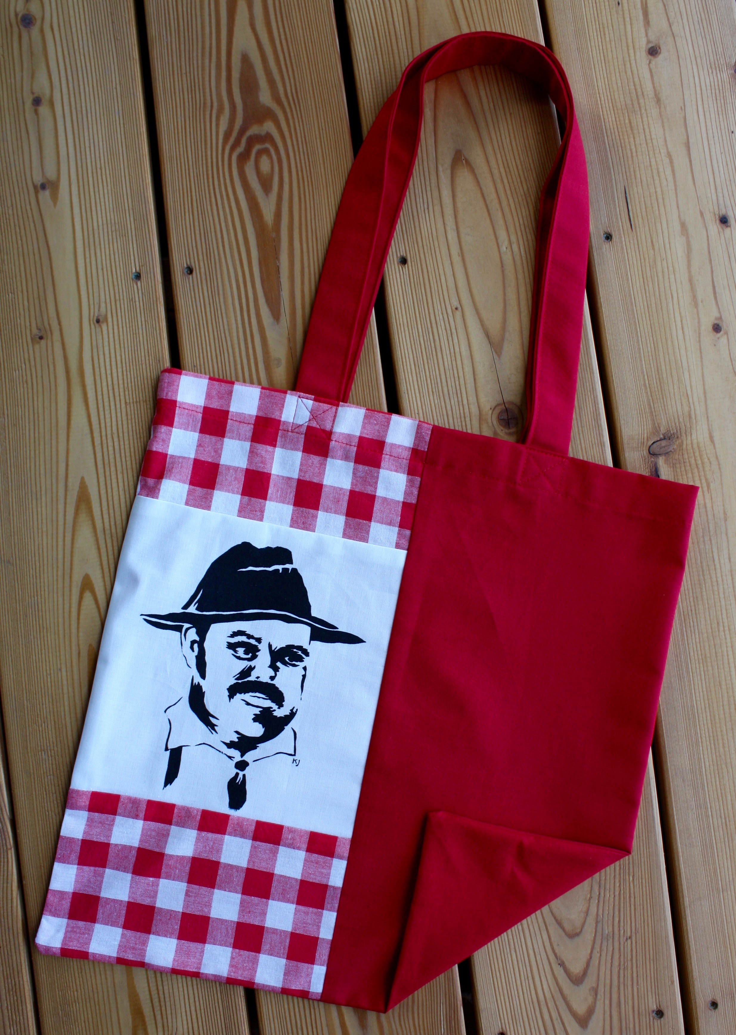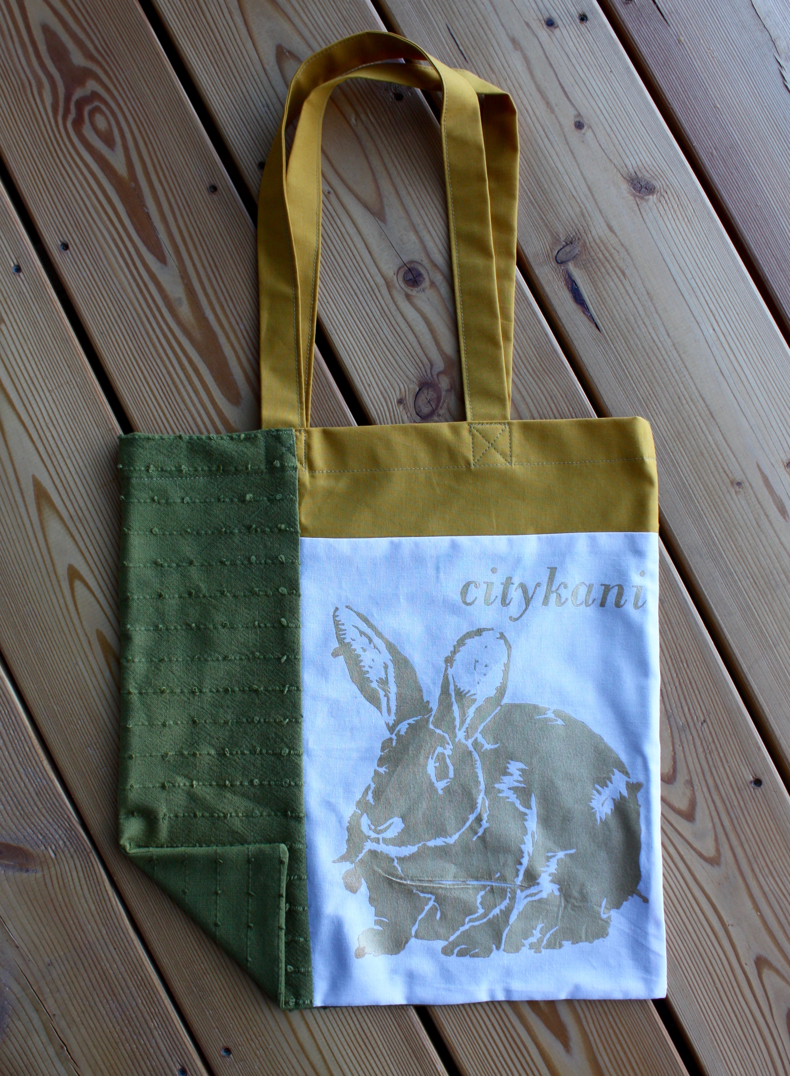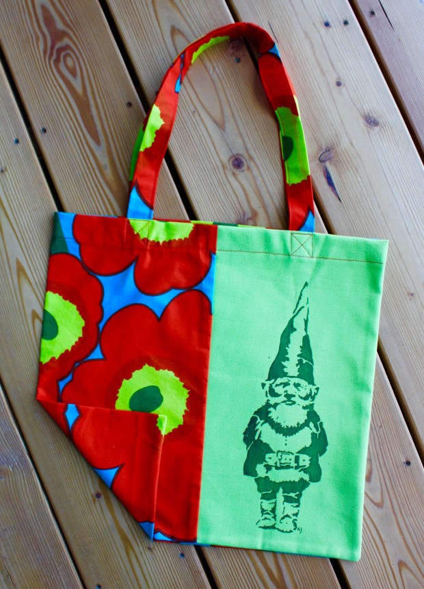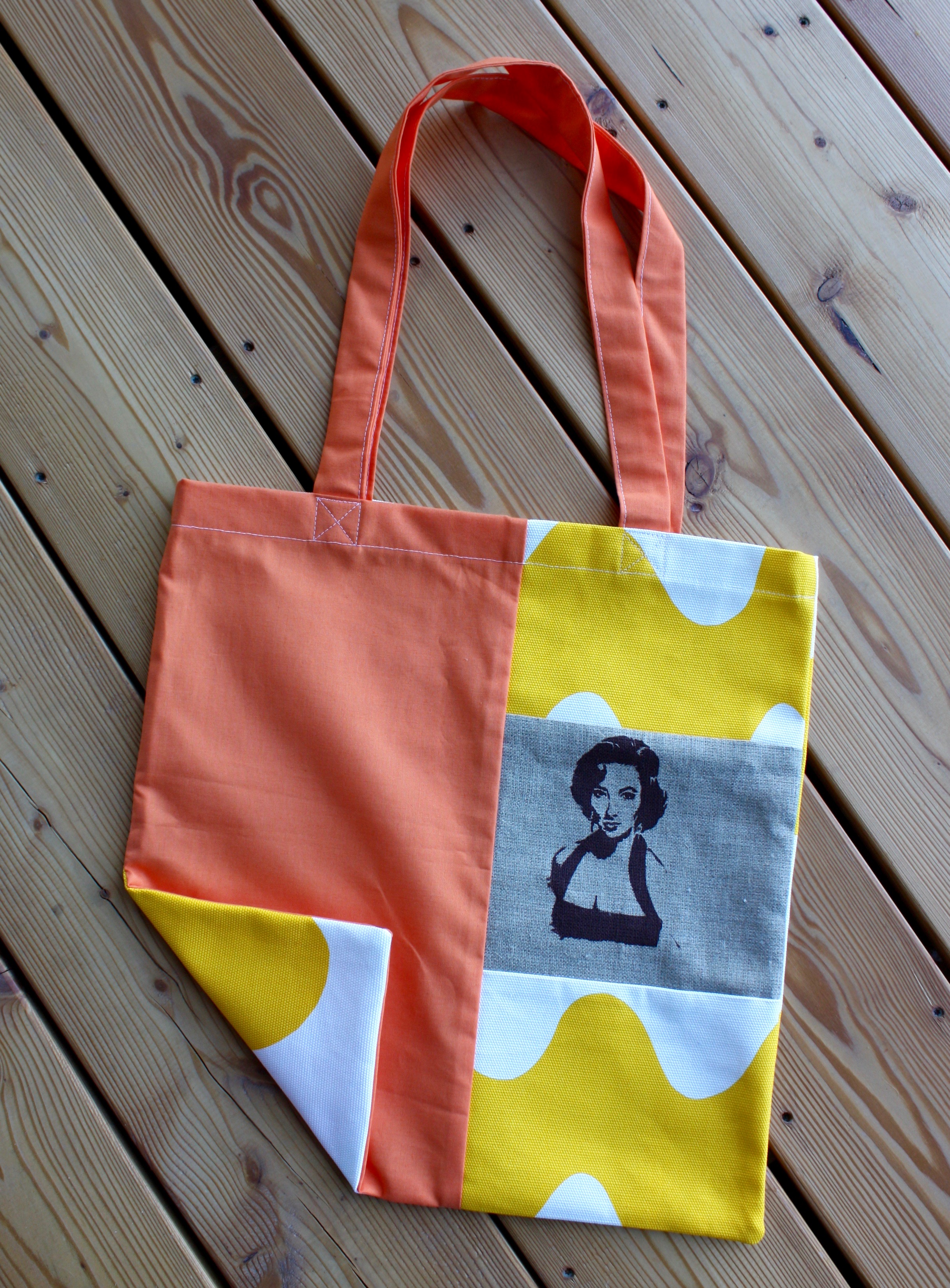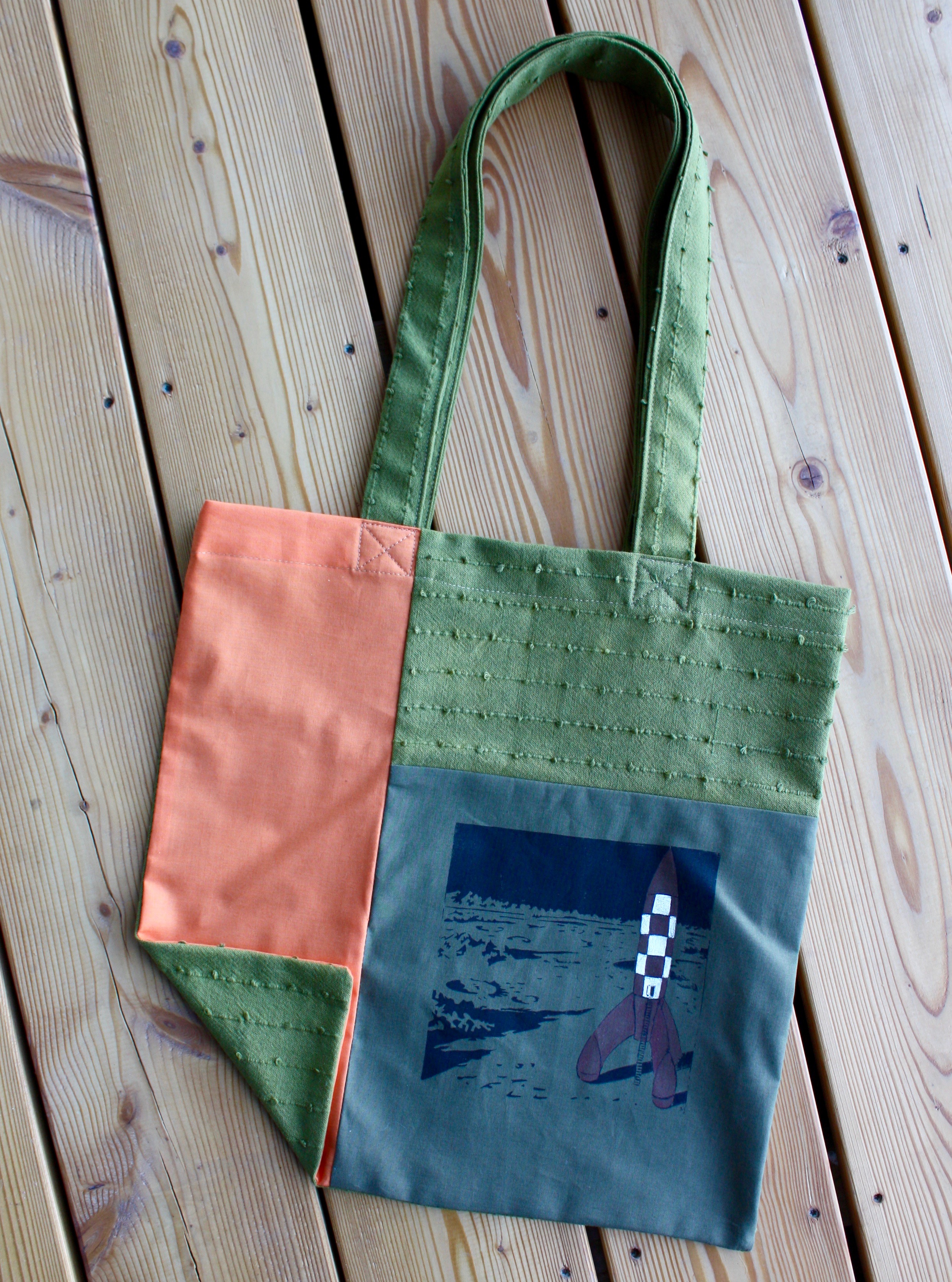 Olen hillonnut kankaanpainannan koevedostilkkuja vuosikausia. Olen säästänyt niitä aivan erityisiin käyttötarpeisiin, ja jossain mielensopukassa on hautunut ajatus, että teen niistä joskus jotain hienoa ja pidän näyttelyn. Ja pah! Tässä elämässä on ihan turha ajatella, että ”sitten joskus”. Niinpä tartuin tuumasta toimeen ja surautin koevedoksista ja kangasvarastoistani kauppakasseja. Tai kirjakasseja. Tai varakasseja, festarikasseja, rakkaalla lapsella on monta nimeä. Tavoitteena on, että kankaat mahtuvat jollain aikavälillä yhteen sängynalussäilytyslaatikkoon.