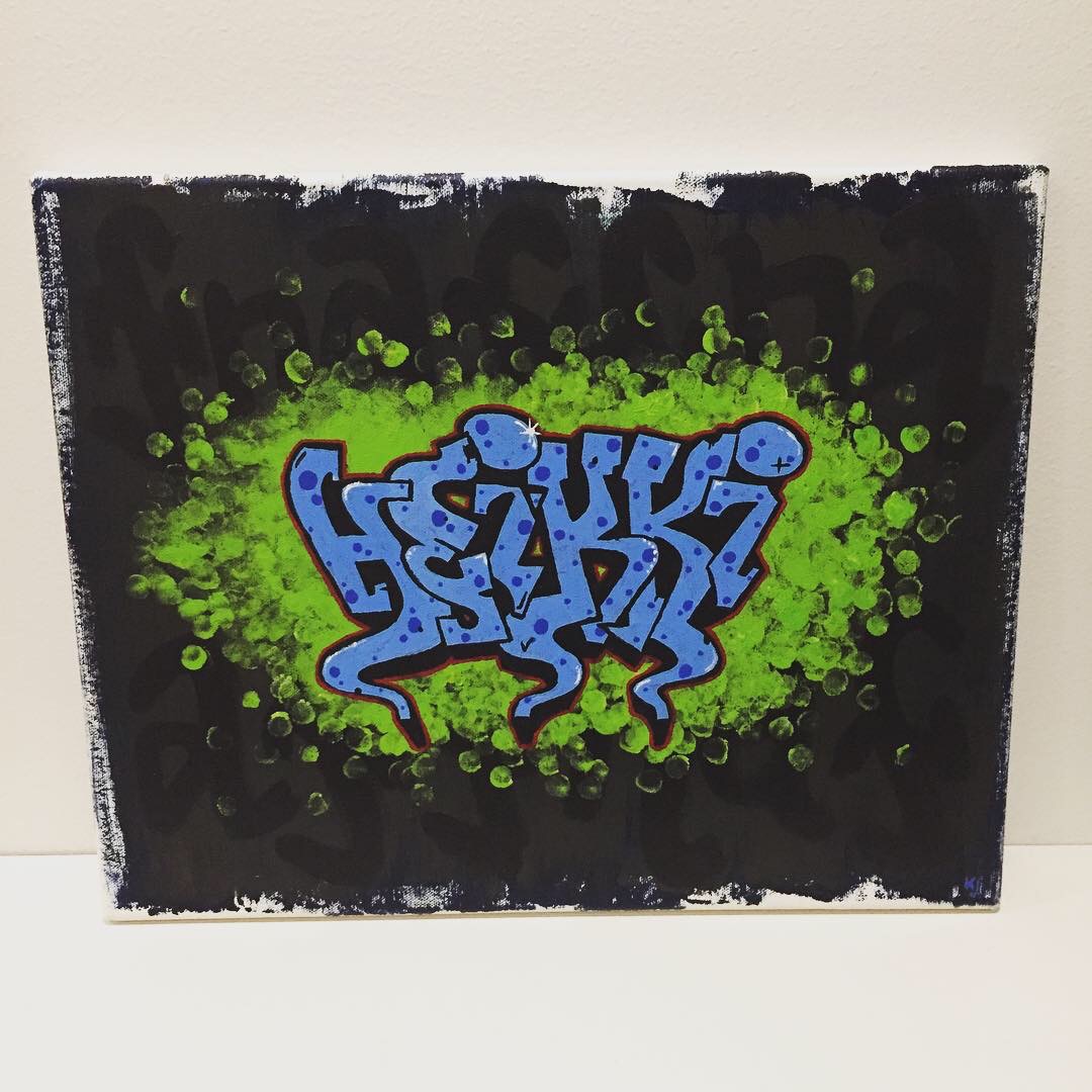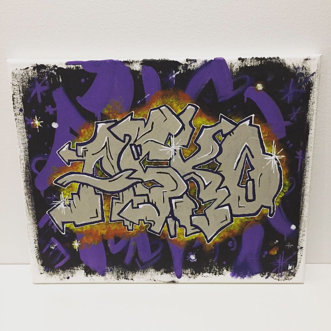Pitkin syksyä lähettelin hänelle inspiraatiokuvia Helsingistä, mm. HAMin näyttelystä ja Suvilahden maalauksista. Myöhemmin syksyllä vieraillessani heillä, mallailimme väri- ja tyylimaailmaa. Matkan varrella pikkuveljetkin alkoivat mieliä omaa versiotaan maalauksesta. Joululahjaksi iteroitui rouhea canvas-maalaus, kullekin jekelle omantyylisensä omalla nimellä.